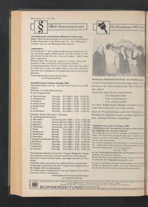 Wegen Ostermontag verschiebt sich die wöchentliche Müllabfuhr in allen Gemeinden in der Woche vom 7.4. - 12.4.1980 jeweils um einen Tag; d.h. von Montag auf Dienstag usw.