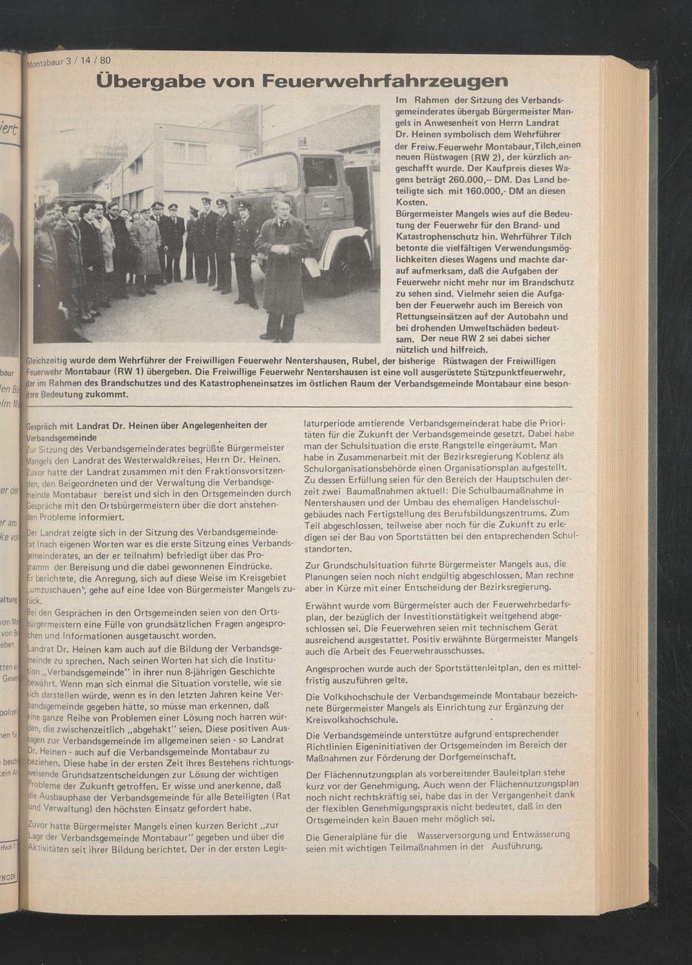 der Freiw. Feuerwehr Montabaur.Tilch.einen neuen Rüstwagen (RW 2), der kürzlich angeschafft wurde. Der Kaufpreis dieses Wagens beträgt 260.000,-- DM. Das Land beteiligte sich mit 160.000,- DM an diesen Kosten.