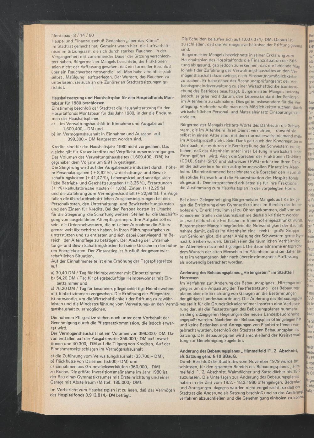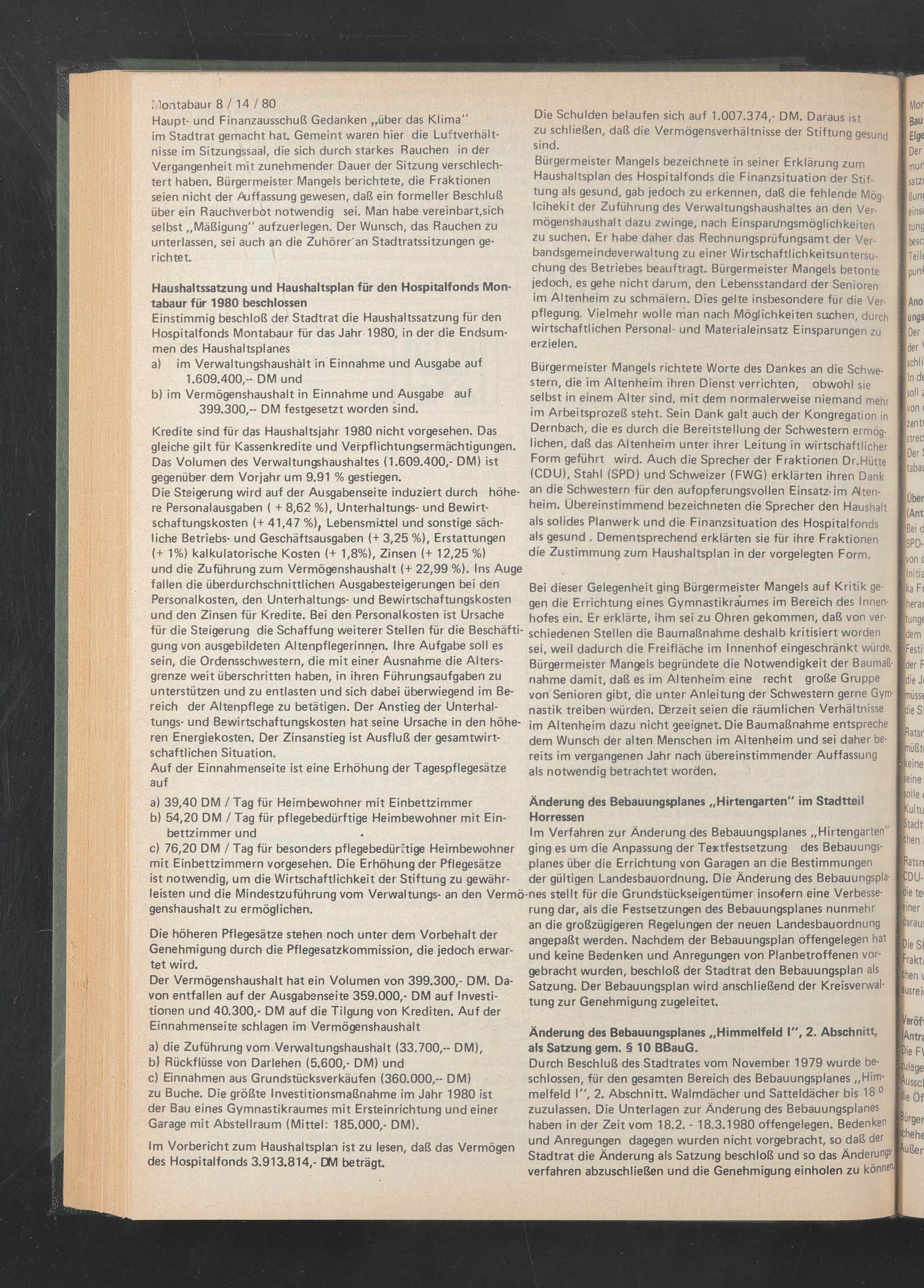 Einstimmig beschloß der Stadtrat die Haushaltssatzung für den Hospitalfonds Montabaur für das Jahr 1980, in der die Endsummen des Haushaltsplanes