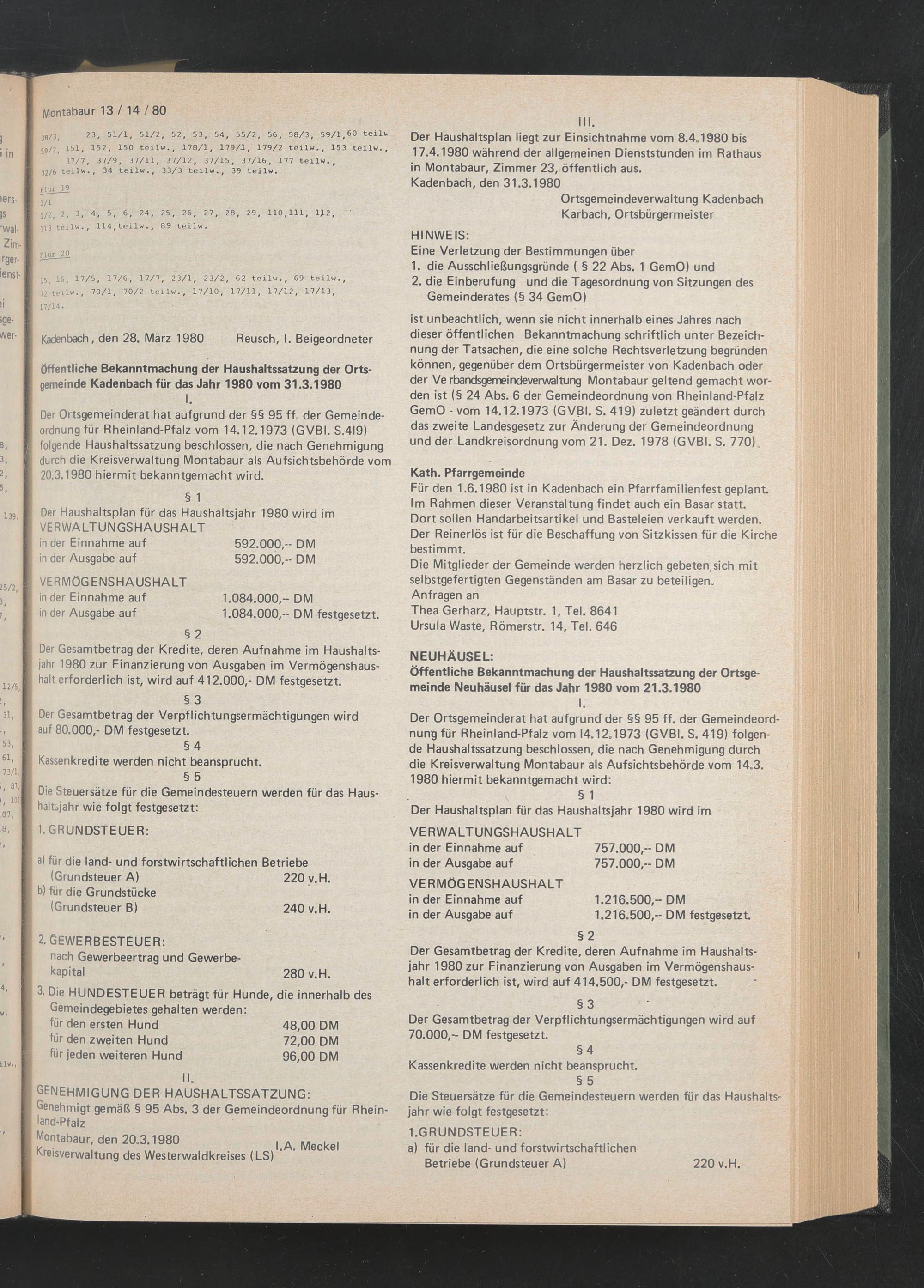 Kadenbach, den 28. März 1980 Reusch, I. Beigeordneter