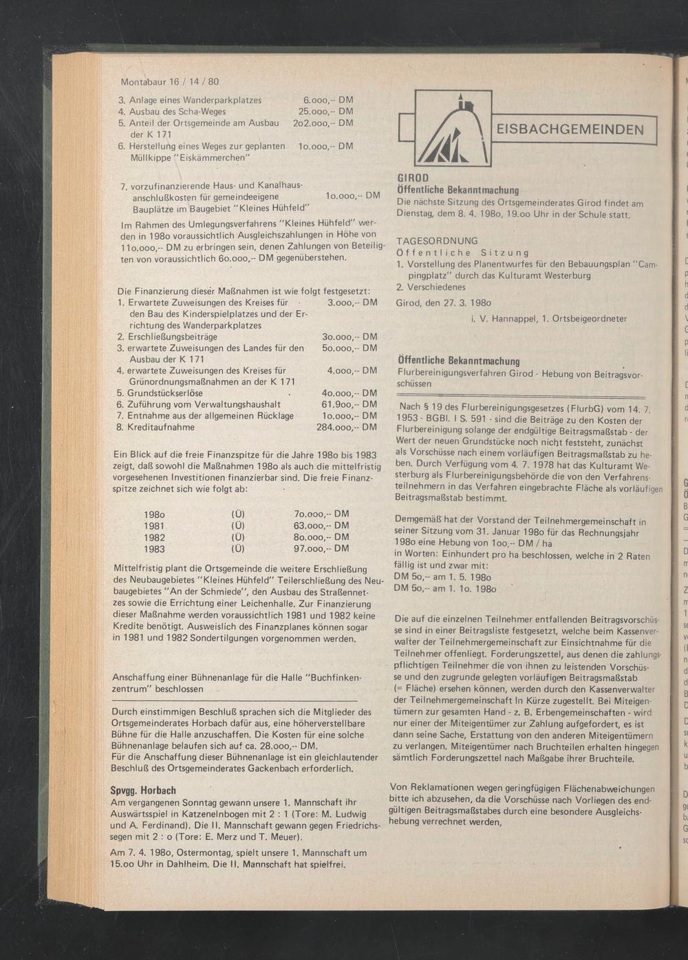 Mittelfristig plant die Ortsgemeinde die weitere Erschließung des Neubaugebietes "Kleines Hühfeld" Teilerschließung des Neubaugebietes "An der Schmiede", den Ausbau des Straßennetzes sowie die Errichtung einer Leichenhalle. Zur Finanzierung dieser Maßnahme werden voraussichtlich 1981 und 1982 keine Kredite benötigt. Ausweislich des Finanzplanes können sogar in 1981 und 1982 Sondertilgungen vorgenommen werden.