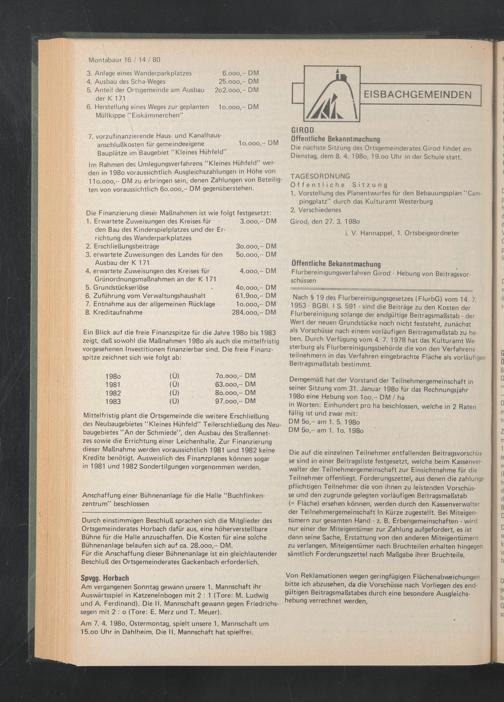 Im Rahmen des Umlegungsverfahrens "Kleines Hühfeld" werden in 198o voraussichtlich Ausgleichszahlungen in Höhe von