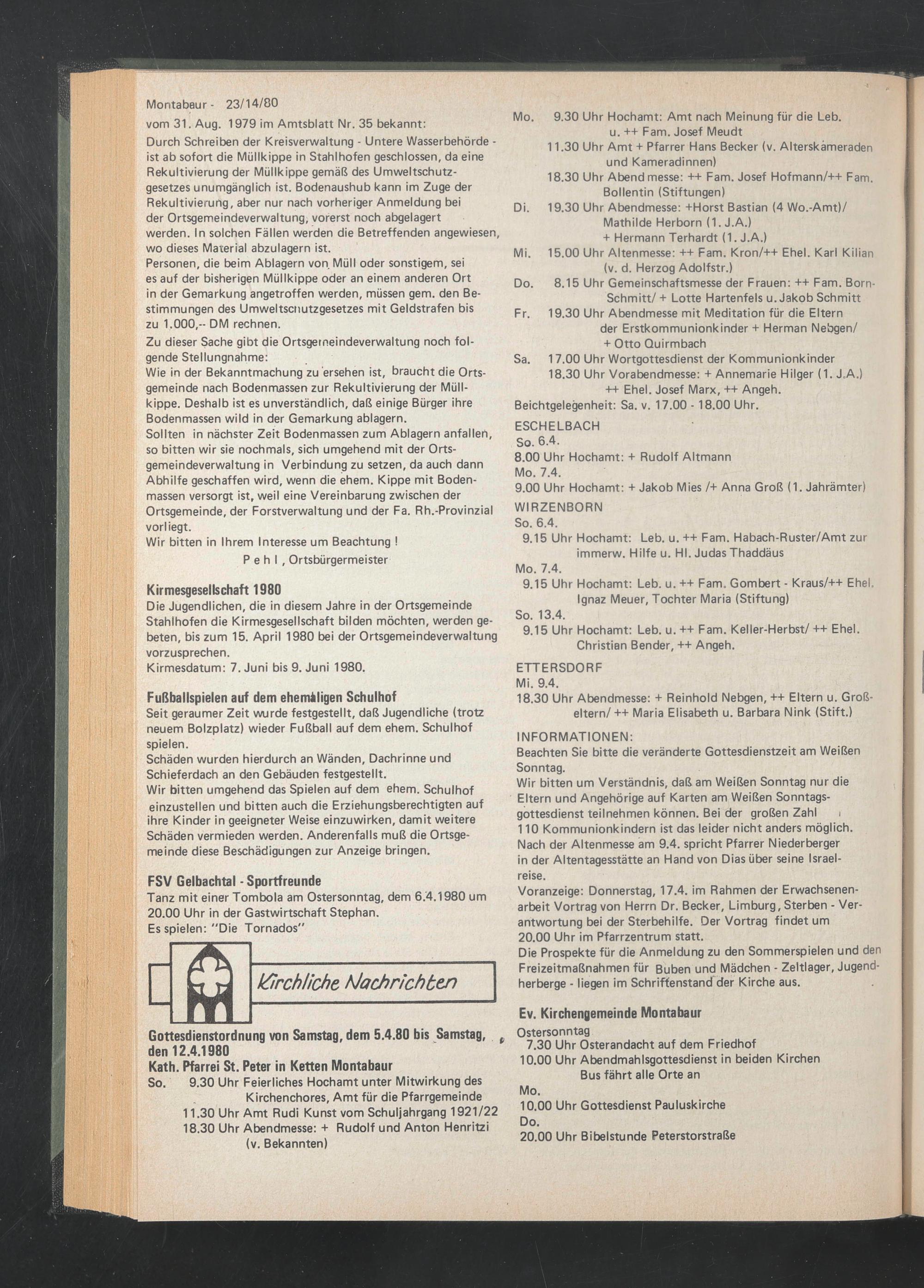 Personen, die beim Ablagern von Müll oder sonstigem, sei es auf der bisherigen Müllkippe oder an einem anderen Ort in der Gemarkung angetroffen werden, müssen gern, den Bestimmungen des Umweltscnutzgesetzes mit Geldstrafen bis zu 1.000,-- DM rechnen.
