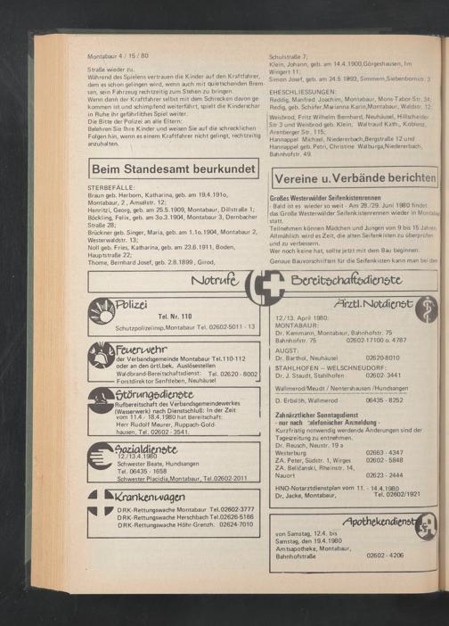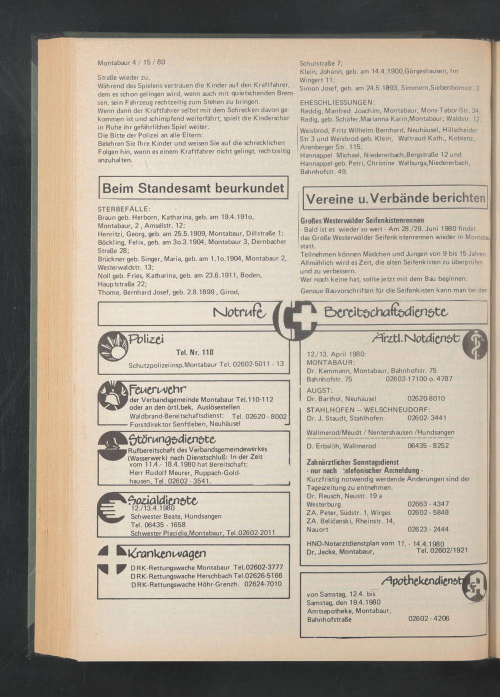 jRufbereitschaft des Verbandsgemeindewerkes (Wasserwerk) nach Dienstschluß: In der Zeit vom 11.4.- 18.4.1980 hat Bereitschaft: