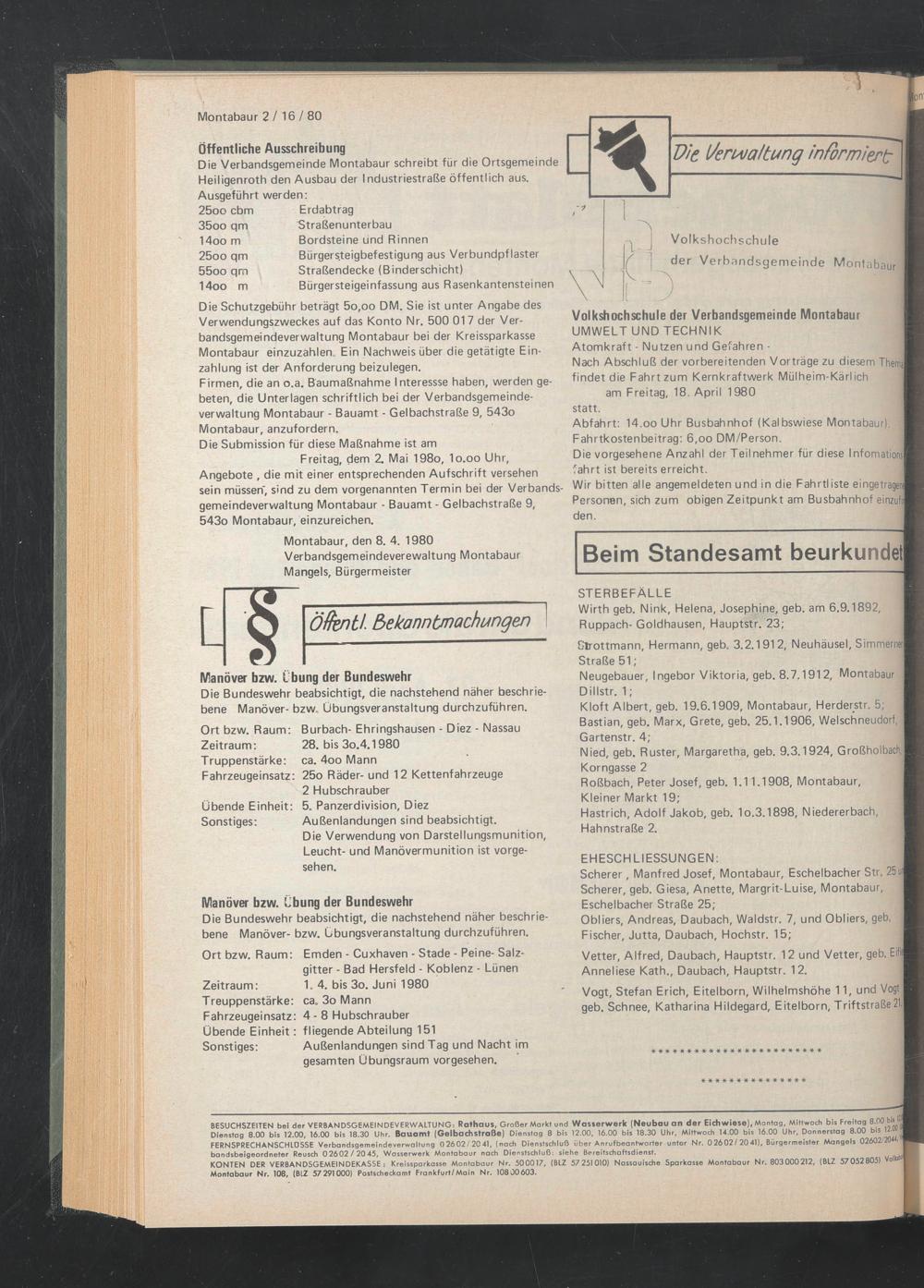 Montabaur, den 8. 4. 1980 Verbandsgemeindeverewaltung Montabaur Mangels, Bürgermeister
