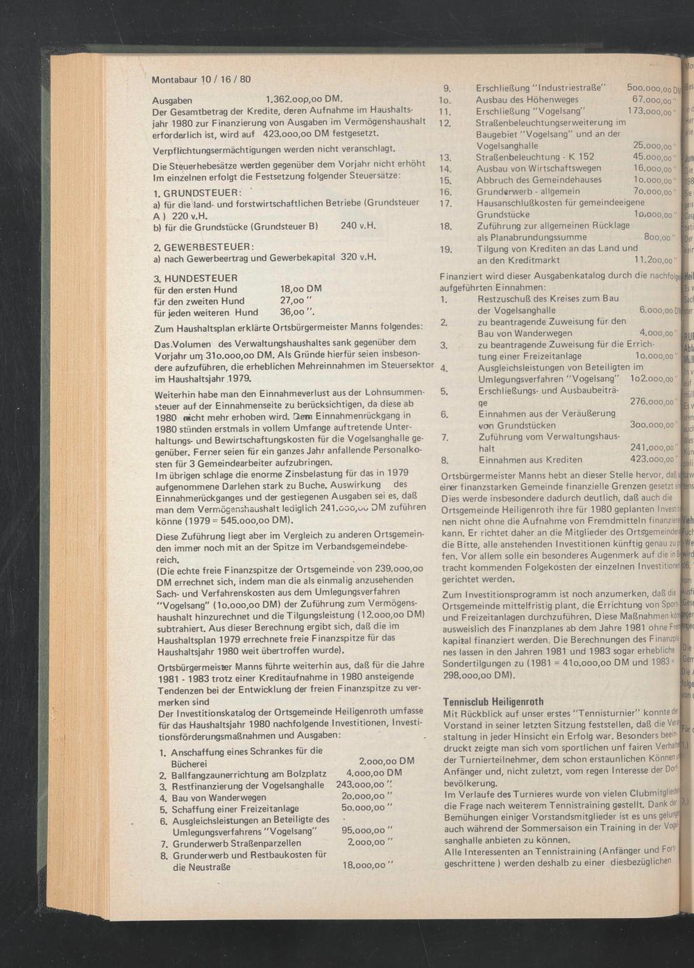 Der Investitionskatalog der Ortsgemeinde Heiligenroth umfasse für das Haushaltsjahr 1980 nachfolgende Investitionen, Investitionsförderungsmaßnahmen und Ausgaben: