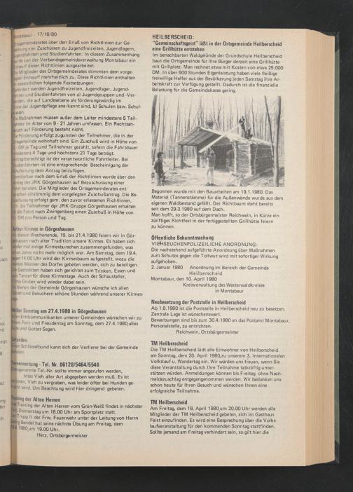 diesem Wochenende, 19. bis 21.4.1980 feiern wir in Görihausen nach alter Tradition unsere Kirmes. Es haben sich «weder mal einige Kirmesburschen zusammengefunden, was schon Jahre nicht mehr möglich war. Am Samstag, dem 19.4.