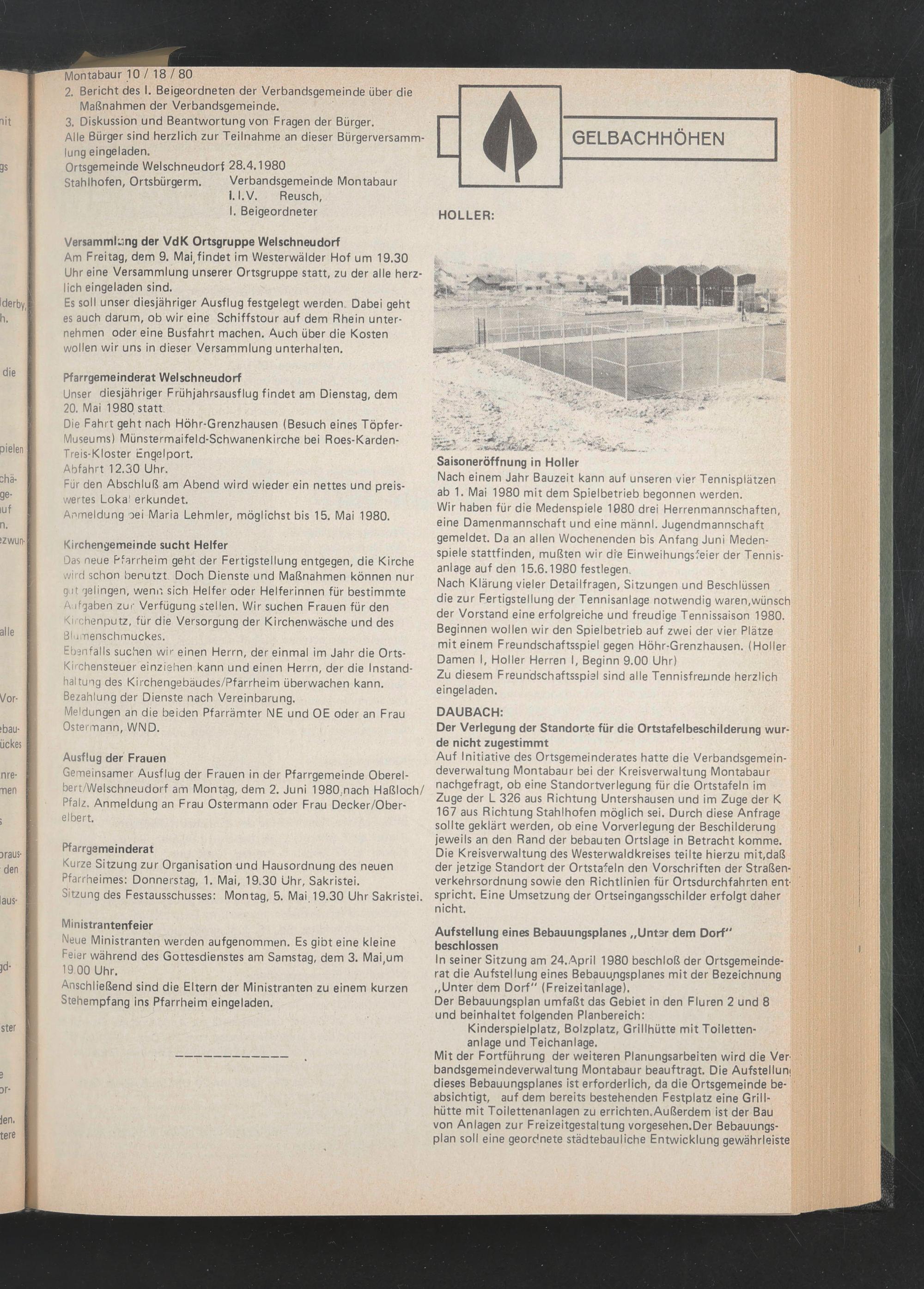 Nach Klärung vieler Detailfragen, Sitzungen und Beschlüssen die zur Fertigstellung der Tennisanlage notwendig waren,wünsch der Vorstand eine erfolgreiche und freudige Tennissaison 1980. Beginnen wollen wir den Spielbetrieb auf zwei der vier Plätze mit einem Freundschaftsspiel gegen Höhr-Grenzhausen. (Holler Damen I, Holler Herren I, Beginn 9.00 Uhr)