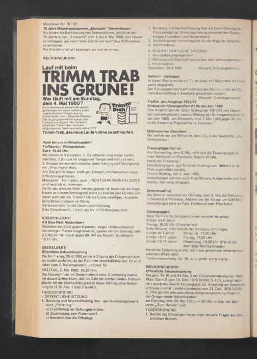 Die für Freitag, 25.4.1980,avisierte Sitzung des Ortsgemeinderates mußte ausfallen, da der Rat nicht beschlußfähig war. Es wird daher zum 2. Mal eingeladen, und zwar für FREITAG, 2. Mai 1980, 19.30 Uhr.