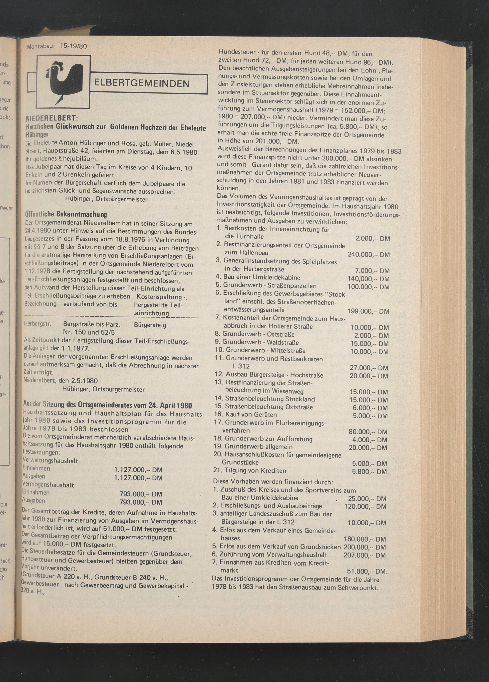 Die Eheleute Anton Hübinger und Rosa, geb. Müller, Niederelbert, Hauptstraße 42, feierten am Dienstag, dem 6.5.1980 ihr goldenes Ehejubiläum.