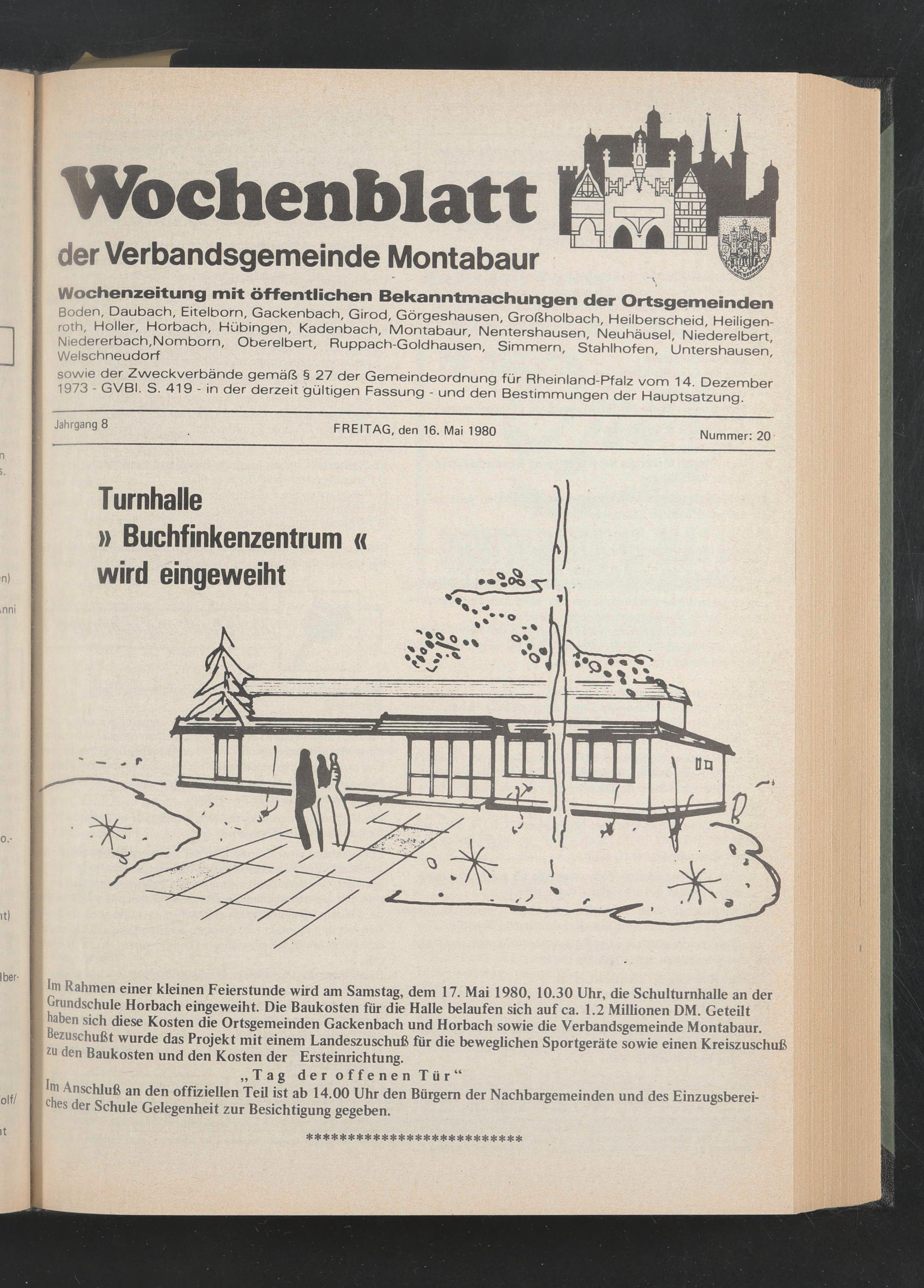 Im Rahmen einer kleinen Feierstunde wird am Samstag, dem 17. Mai 1980, 10.30 Uhr, die Schulturnhalle an der Grundschule Horbach eingeweiht. Die Baukosten für die Halle belaufen sich auf ca. 1.2 Millionen DM. Geteilt haben sich diese Kosten die Ortsgemeinden Gackenbach und Horbach sowie die Verbandsgemeinde Montabaur. Bezuschußt wurde das Projekt mit einem Landeszuschuß für die beweglichen Sportgeräte sowie einen Kreiszuschuß zu den Baukosten und den Kosten der Ersteinrichtung.