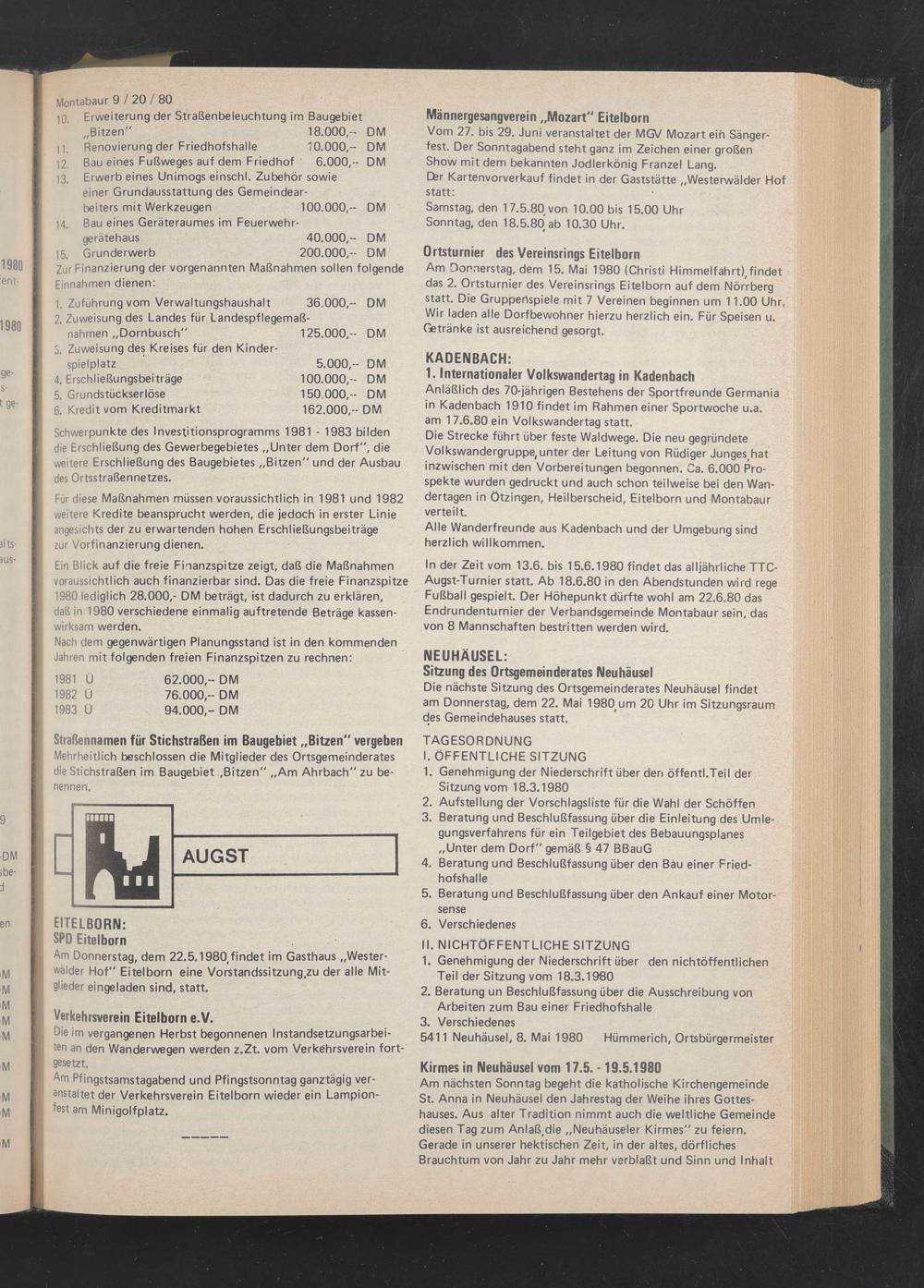 Die nächste Sitzung des Ortsgemeinderates Neuhäusel findet am Donnerstag, dem 22. Mai 1980 um 20 Uhr im Sitzungsraum des Gemeindehauses statt.