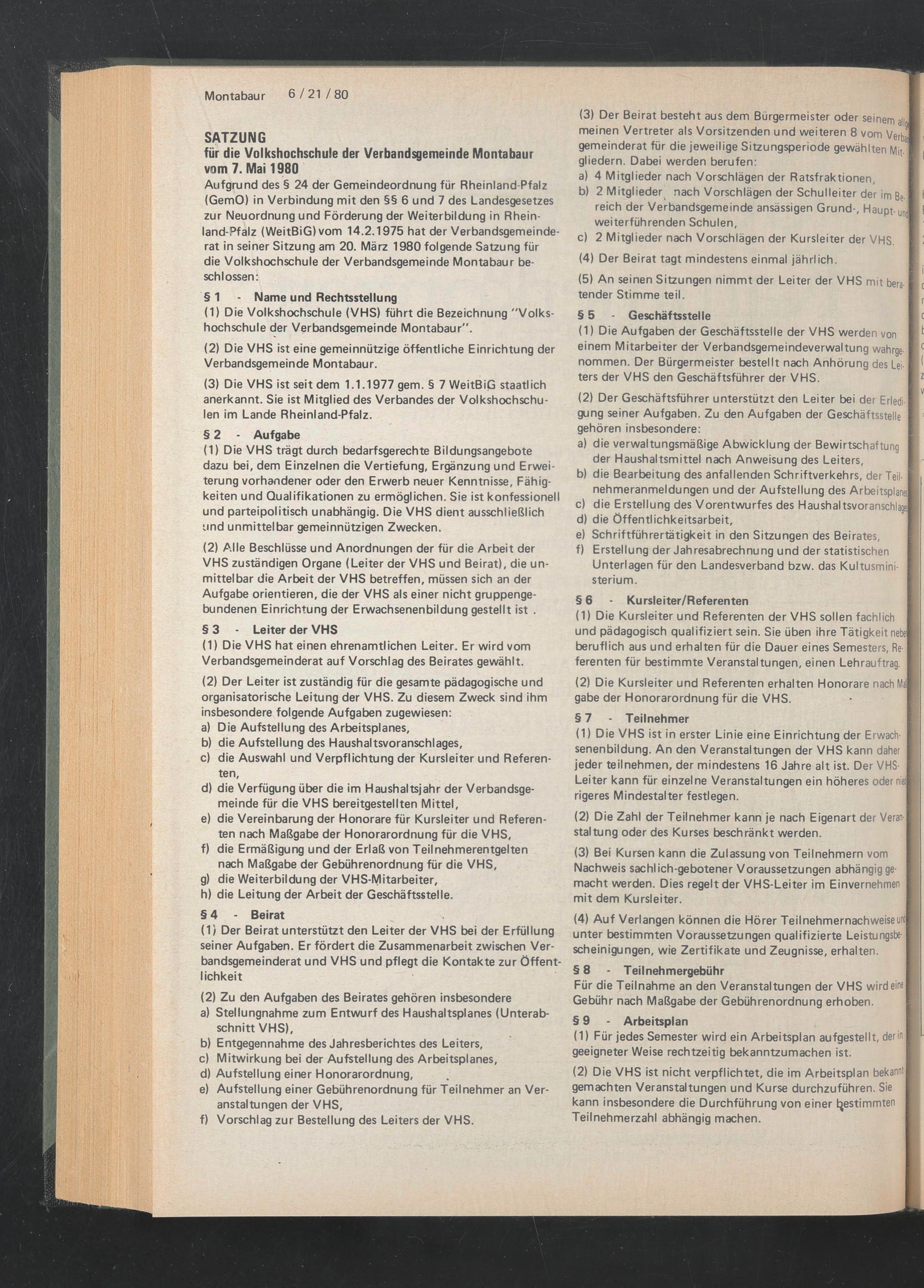 Aufgrund des § 24 der Gemeindeordnung für Rheinland-Pfalz (GemO) in Verbindung mit den §§ 6 und 7 des Landesgesetzes zur Neuordnung und Förderung der Weiterbildung in Rheinland-Pfalz (WeitBiG) vom 14.2.1975 hat der Verbandsgemeinderat in seiner Sitzung am 20. März 1980 folgende Satzung für die Volkshochschule der Verbandsgemeinde Montabaur beschlossen: