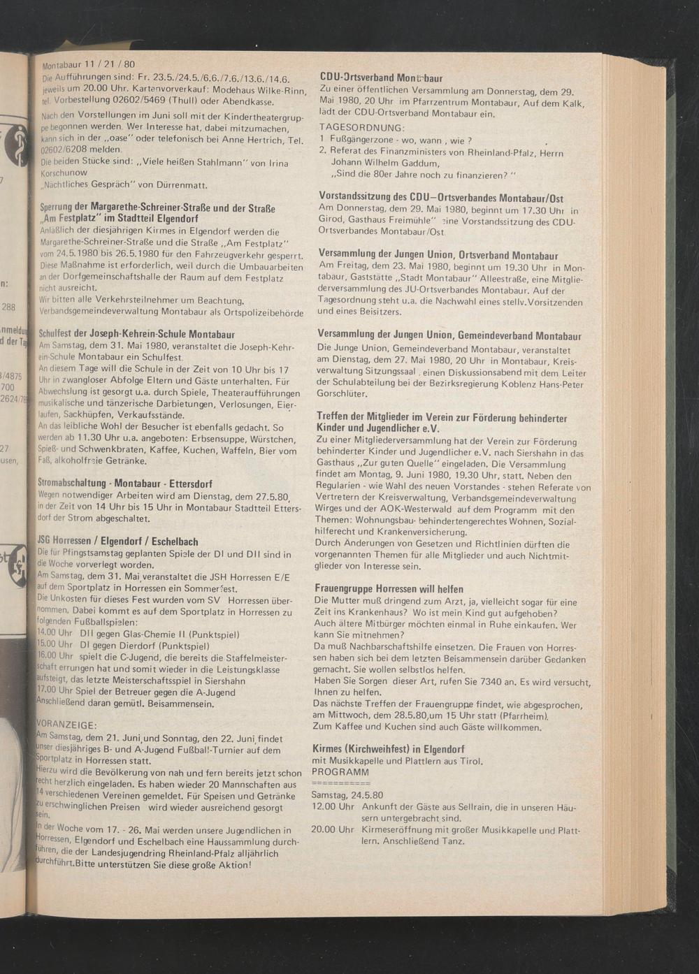 Die Junge Union, Gemeindeverband Montabaur, veranstaltet am Dienstag, dem 27. Mai 1980, 20 Uhr in Montabaur, Kreisverwaltung Sitzungssaal , einen Diskussionsabend mit dem Leiter der Schulabteilung bei der Bezirksregierung Koblenz Hans-Peter Gorschlüter.