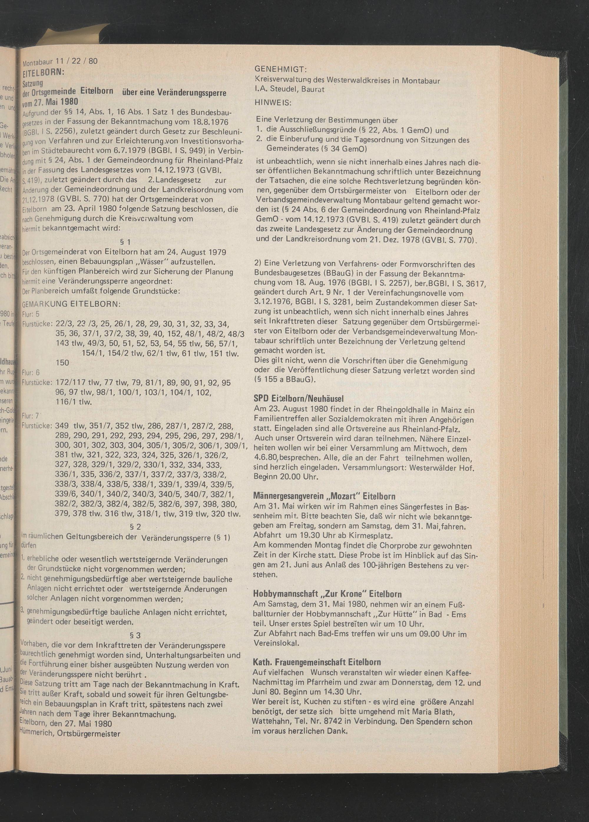 I der Ortsgemeinde Eitelborn über eine Veränderungssperre | vo m 27. Mai 1980