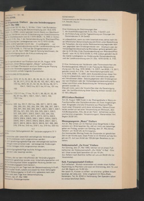 ist unbeachtlich, wenn sie nicht innerhalb eines Jahres nach dieser öffentlichen Bekanntmachung schriftlich unter Bezeichnung der Tatsachen, die eine solche Rechtsverletzung begründen können, gegenüber dem Ortsbürgermeister von Eitelborn oder der Verbandsgemeindeverwaltung Montabaur geltend gemacht worden ist (§ 24 Abs. 6 der Gemeindeordnung von Rheinland-Pfalz GemO - vom 14.12.1973 (GVBI. S. 419) zuletzt geändert durch das zweite Landesgesetz zur Änderung der Gemeindeordnung und der Landkreisordnung vom 21. Dez. 1978 (GVBI. S. 770).