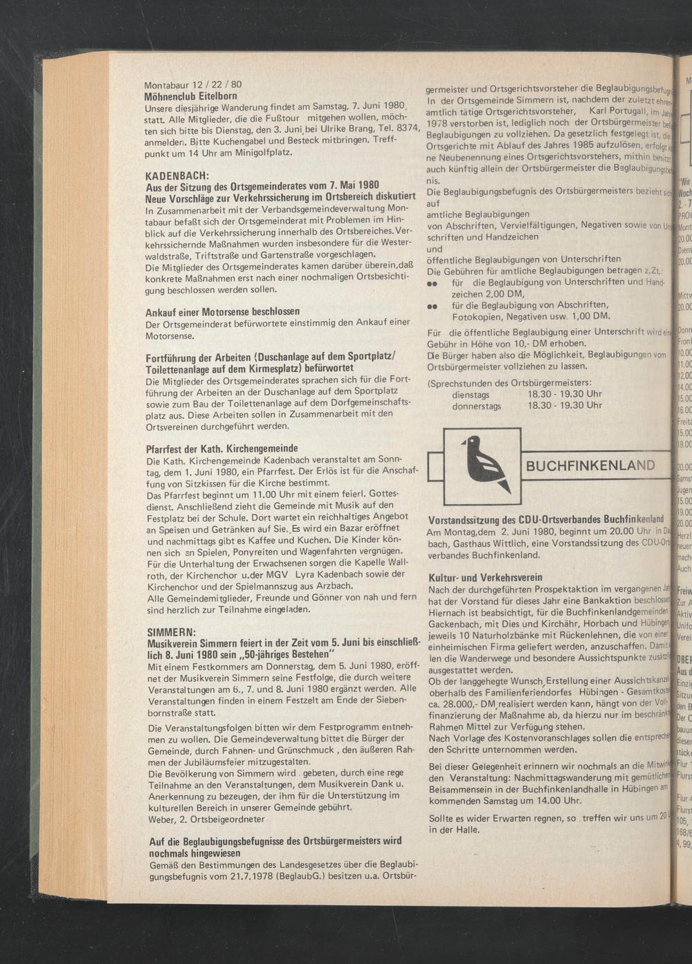 Die Kath. Kirchengemeinde Kadenbach veranstaltet am Sonntag, dem 1. Juni 1980, ein Pfarrfest. Der Erlös ist für die Anschaffung von Sitzkissen für die Kirche bestimmt.