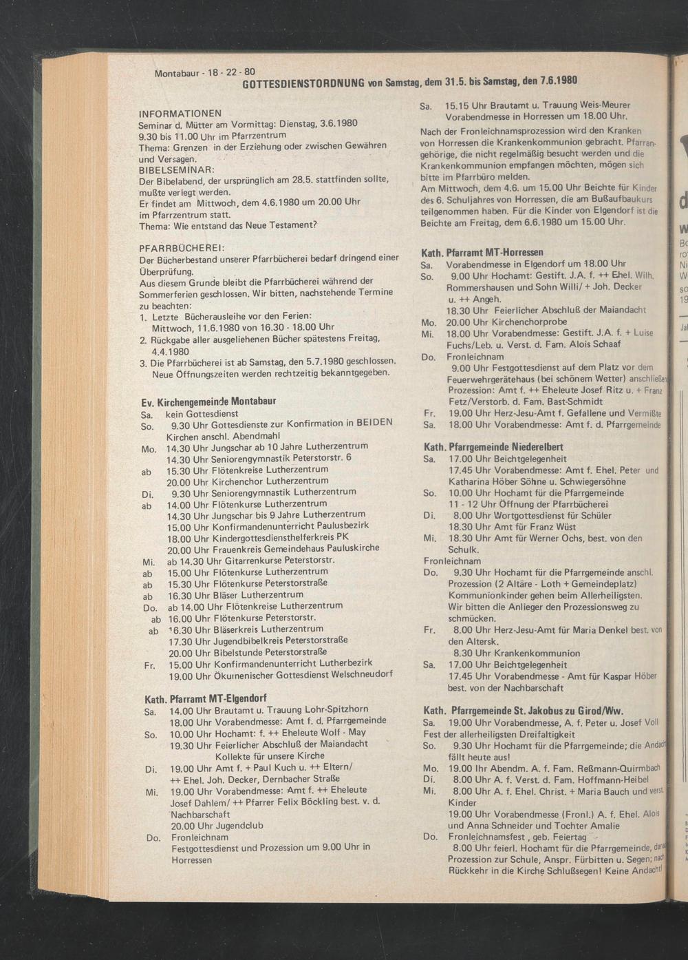 GOTTESDIENSTORDNUNG von Samstag, dem 31.5. bis Samstag, den 7.6.1980