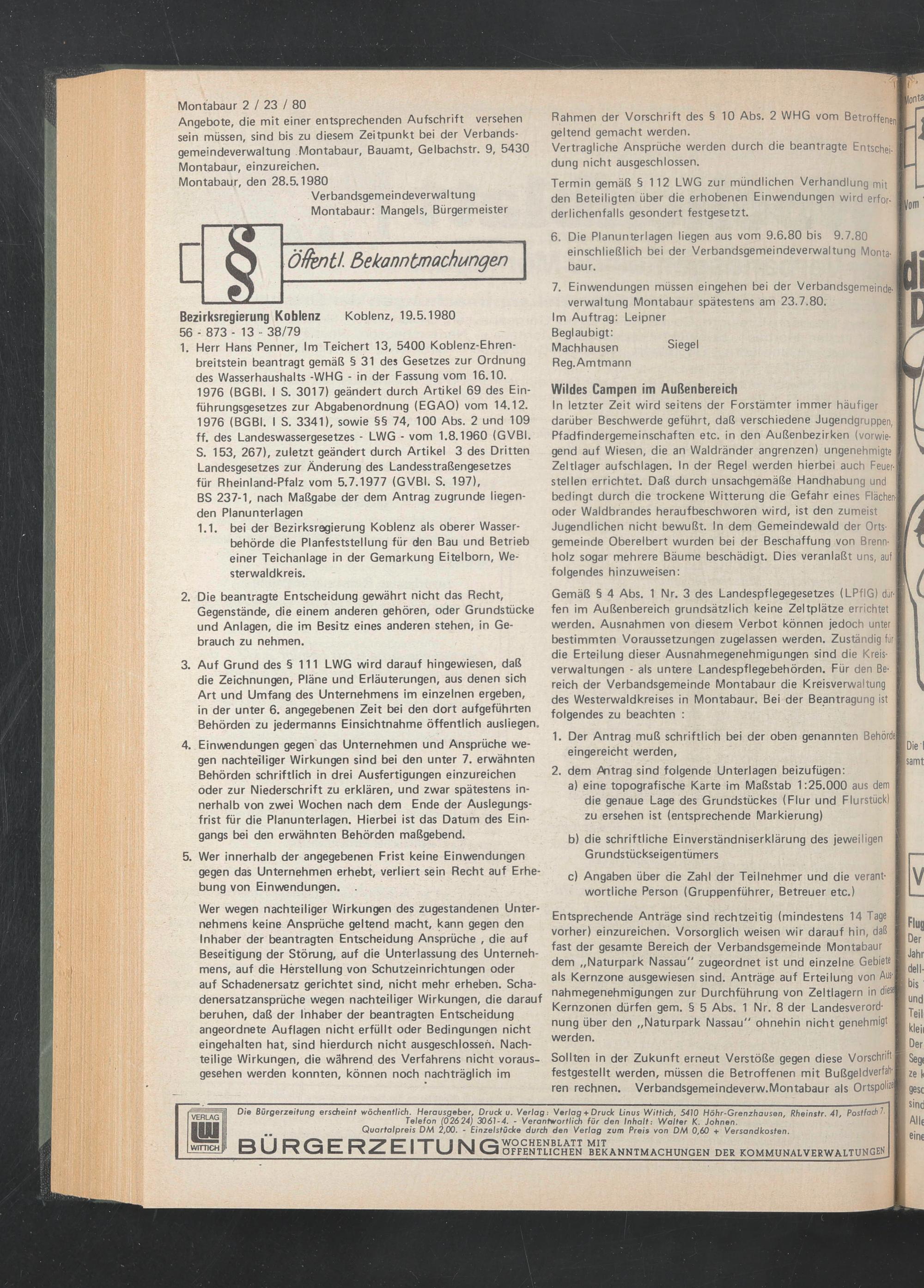7. Einwendungen müssen eingehen bei der Verbandsgemeindeverwaltung Montabaur spätestens am 23.7.80.