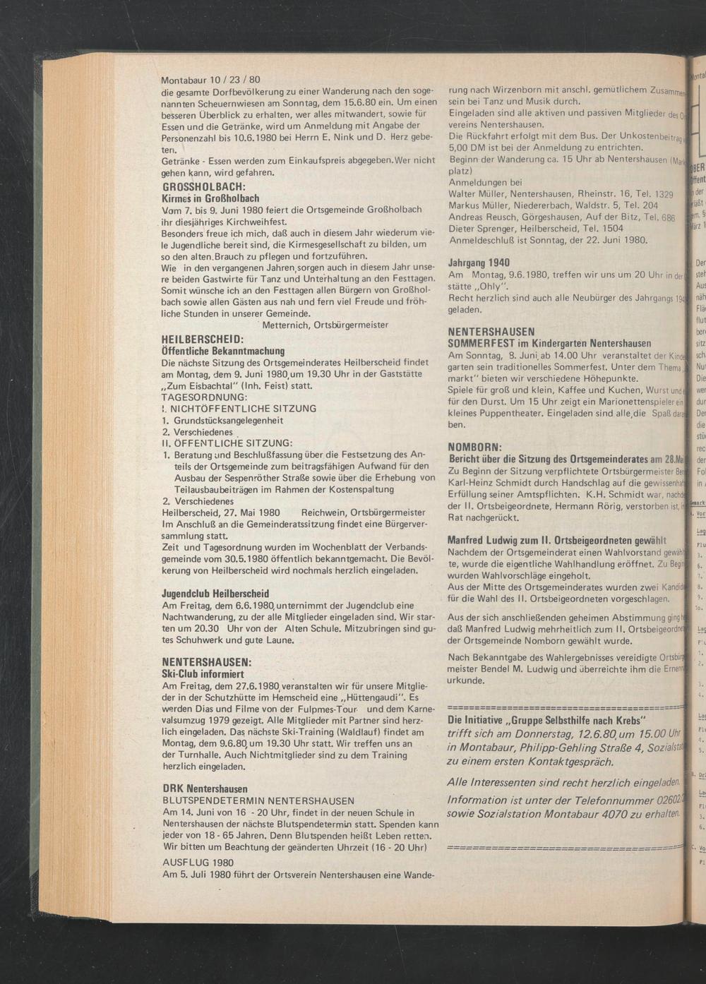 Heilberscheid, 27. Mai 1980 Reichwein, Ortsbürgermeister Im Anschluß an die Gemeinderatssitzung findet eine Bürgerversammlung statt.