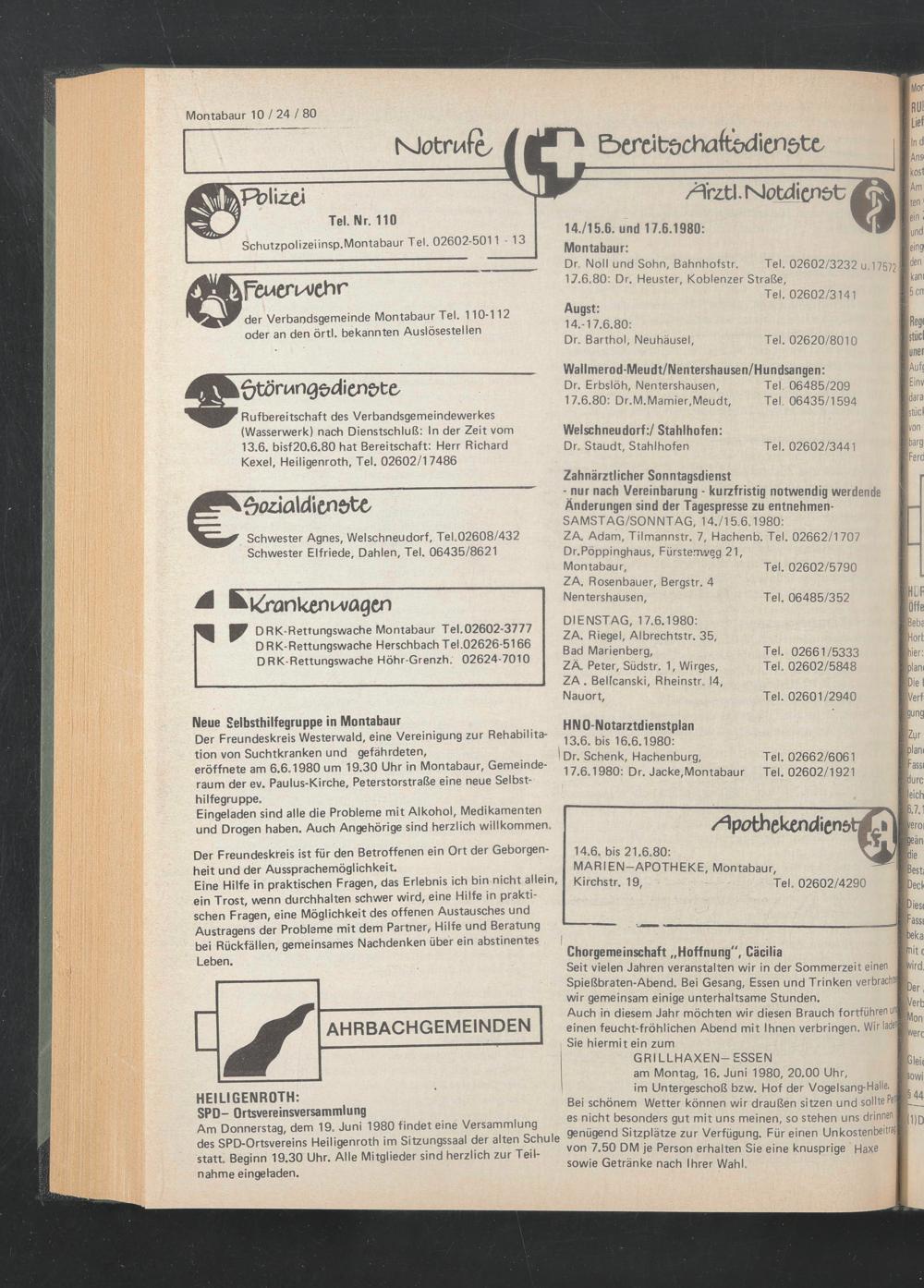 Rufbereitschaft des Verbandsgemeindewerkes (Wasserwerk) nach Dienstschluß: In der Zeit vom 13.6. bisf20.6.80 hat Bereitschaft: Herr Richard Kexel, Heiligenroth, Tel. 02602/17486