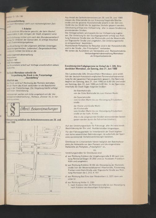 Die Landesstraße 326, Ortsdurchfahrt Montabaur, wird anläßlich der deutsch-französisch-englischen Partnerschaftsveranstaltung für den gesamten Fahrzeugverkehr gesperrt. Die Sperrung beginnt am Samstag, dem 21. Juni 1980, um 6.00 Uhr und endet am Sonntag, dem 22. Juni 1980,um 6.00 Uhr, In der Sperrzone innerhalb der Stadt liegen folgende Straßen:
