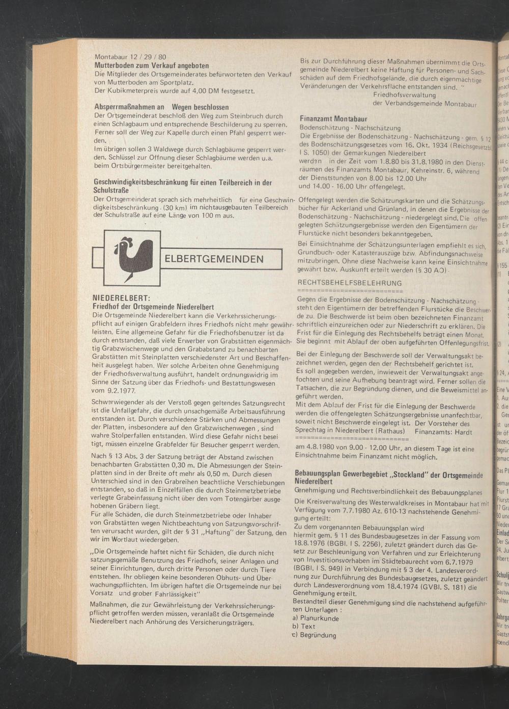 Die Ergebnisse der Bodenschätzung - Nachschätzung - gern. § 12i des Bodenschätzungsgesetzes vom 16. Okt. 1934 (Reichsgesetzbll I S. 1050) der Gemarkungen Niederelbert werden in der Zeit vom 1.8.80 bis 31.8.1980 in den Diensträumen des Finanzamts Montabaur, Kehreinstr. 6, während der Dienststunden von 8.00 bis 12.00 Uhr und 14.00 - 16.00 Uhr offengelegt.