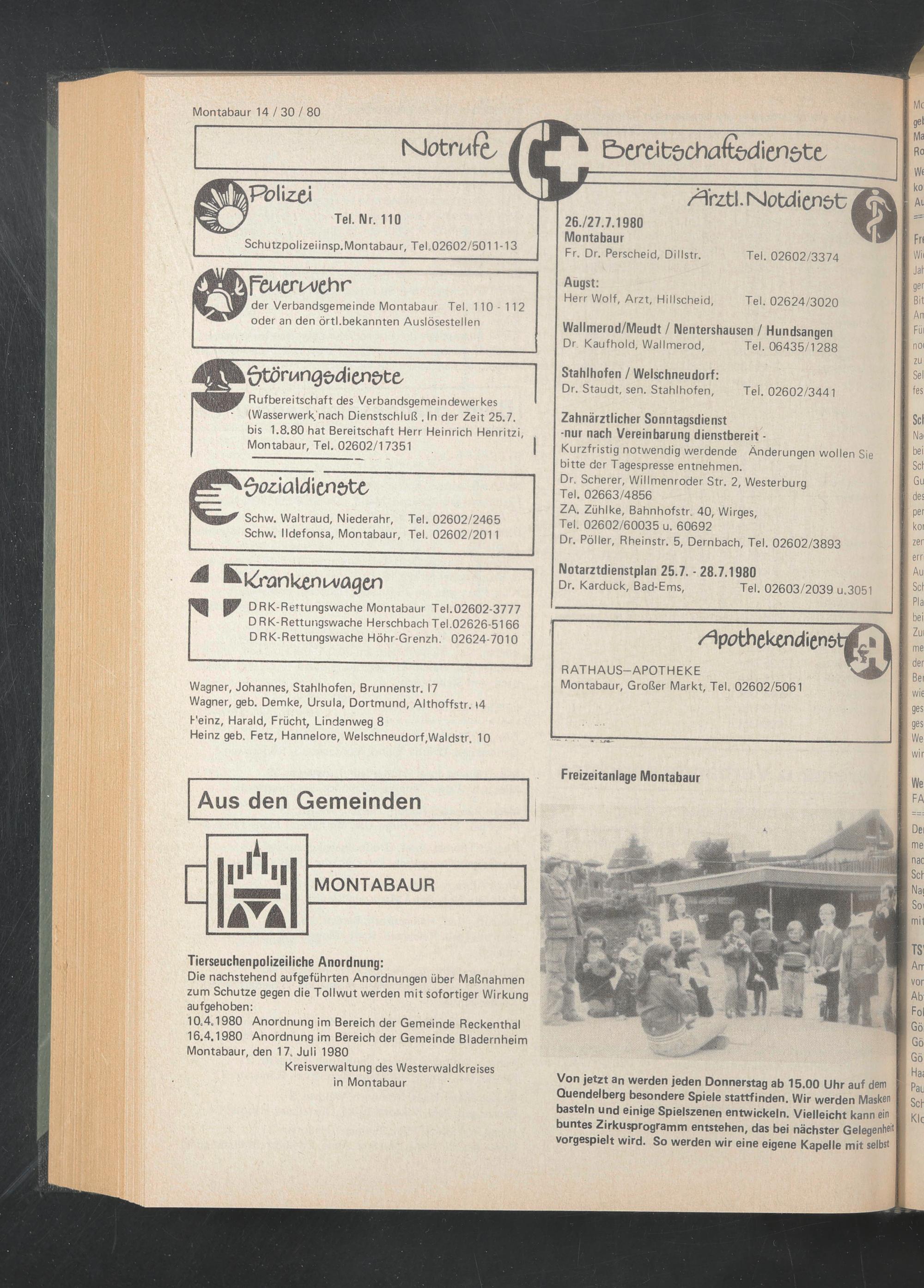 Rufbereitschaft des Verbandsgemeindewerkes (Wasserwerk'nach Dienstschluß . In der Zeit 25.7. bis 1.8.80 hat Bereitschaft Herr Heinrich Henritzi, Montabaur, Tel. 02602/17351