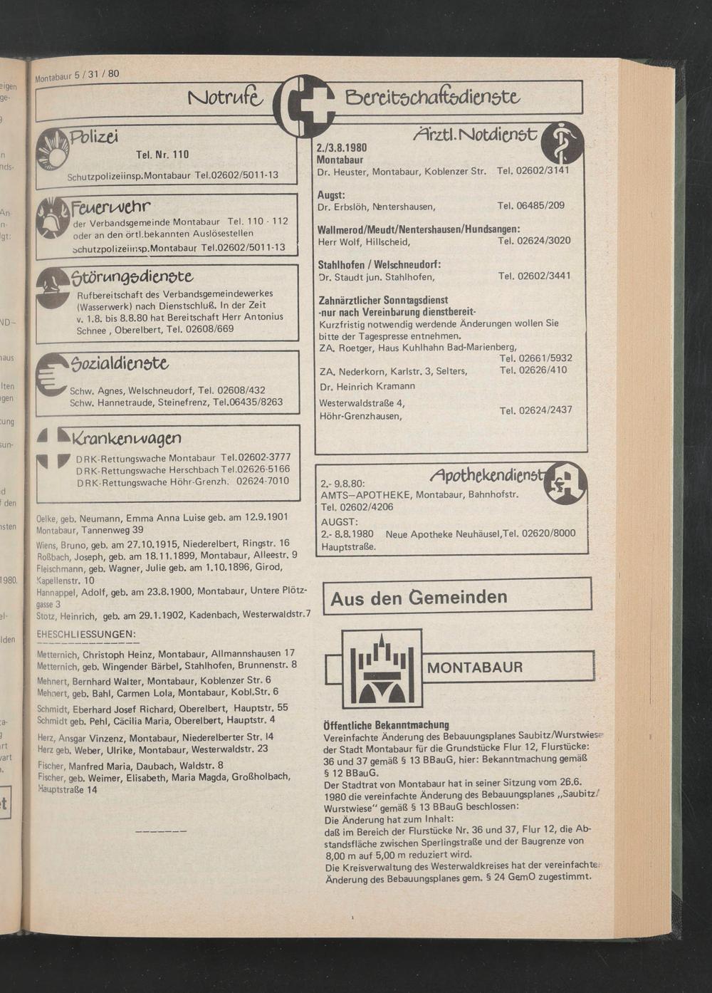Rufbereitschaft des Verbandsgemeindewerkes (Wasserwerk) nach Dienstschluß. In der Zeit v. 1.8. bis 8.8.80 hat Bereitschaft Herr Antonius Schnee , Oberelbert, Tel. 02608/669