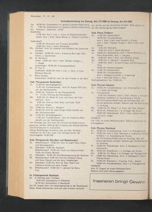 Gottesdienstordnung von Samstag, dem 2.8.1980 bis Samstag, den 9.8.1980