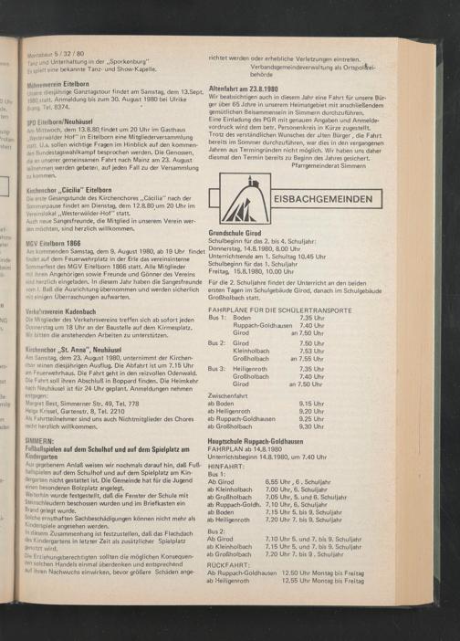 Am Samstag, dem 23. August 1980, unternimmt der Kirchenchor seinen diesjährigen Ausflug. Die Abfahrt ist um 7.15 Uhr am Feuerwehrhaus. Die Fahrt geht in den reizvollen Odenwald. Die Fahrt soll ihren Abschluß in Boppard finden. Die Heimkehr nach Neuhäusel ist für 24 Uhr geplant. Anmeldungen nehmen entgegen: