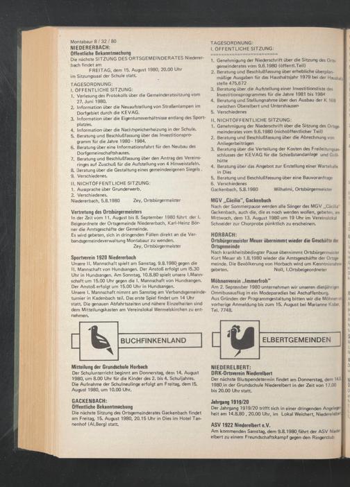 Die nächste Sitzung des Ortsgemeinderates Gackenbach findet am Freitag, 15. August 1980, 20.15 Uhr in Dies im Hotel Tannenhof (AI.Berg) statt.
