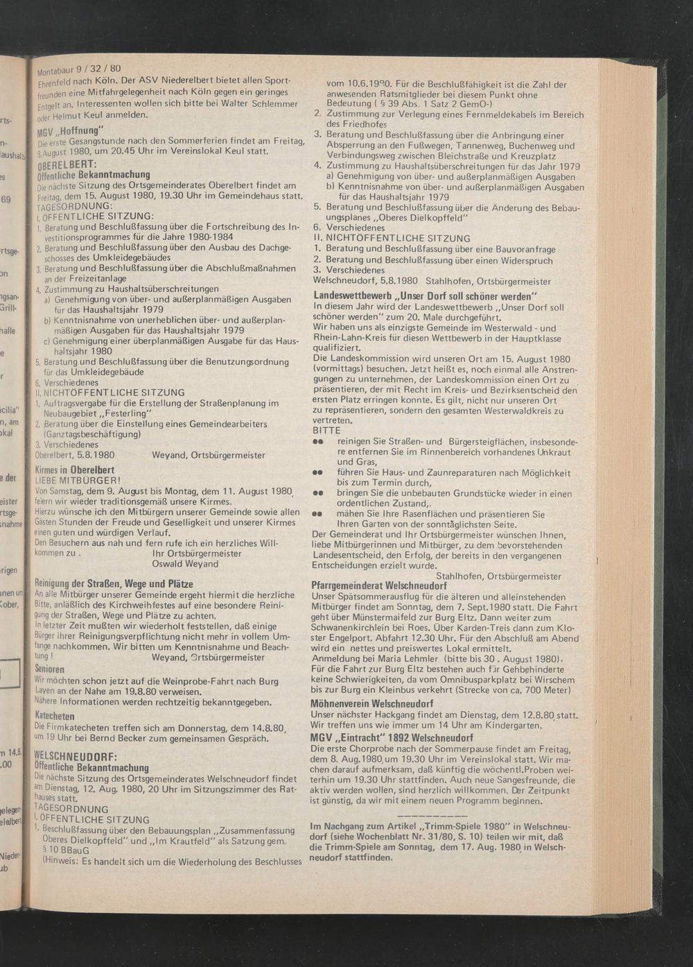 Die nächste Sitzung des Ortsgemeinderates Oberelbert findet am Freitag, dem 15. August 1980, 19.30 Uhr im Gemeindehaus statt. TAGESORDNUNG: