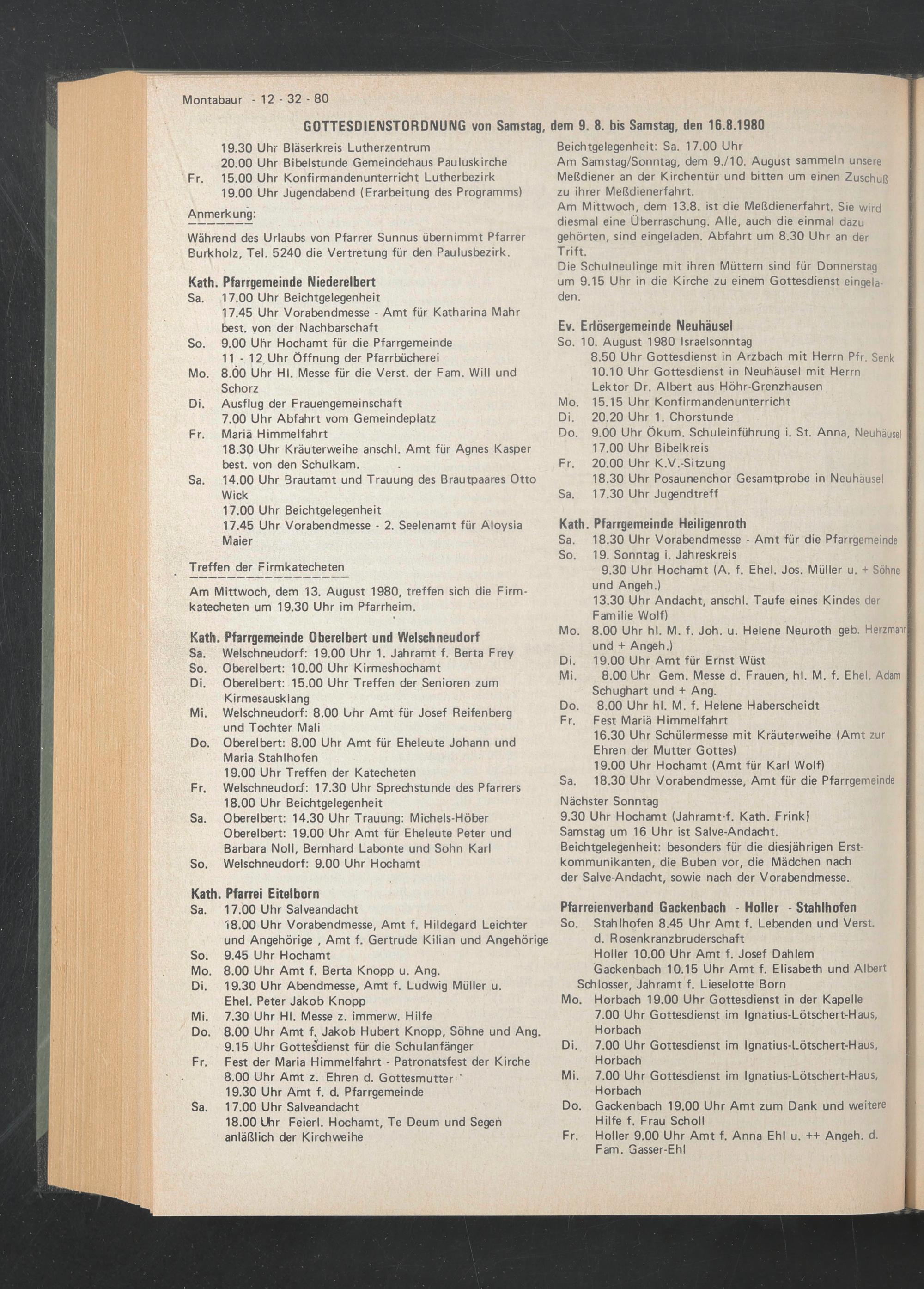 Am Mittwoch, dem 13. August 1980, treffen sich die Firmkatecheten um 19.30 Uhr im Pfarrheim.