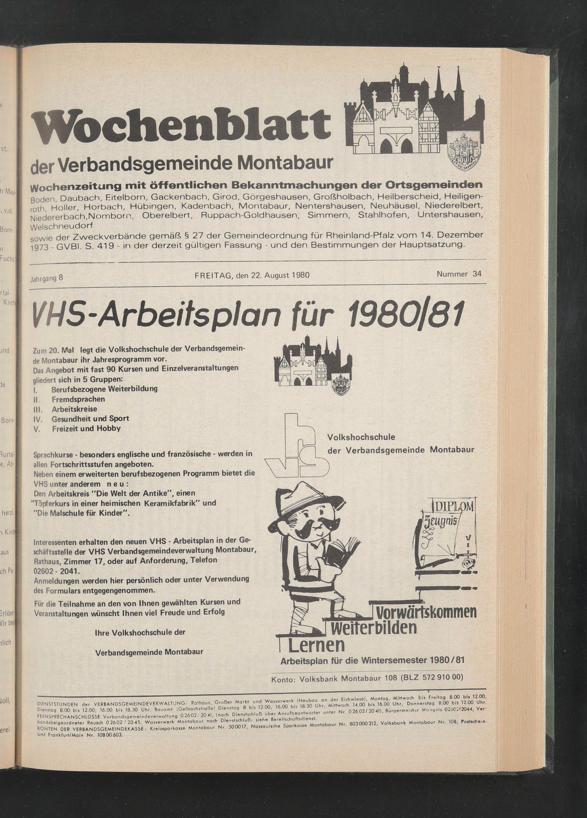 Interessenten erhalten den neuen VHS - Arbeitsplan in der Geschäftsstelle der VHS Verbandsgemeindeverwaltung Montabaur, Rathaus, Zimmer 17, oder auf Anforderung, Telefon 02602 - 2041.