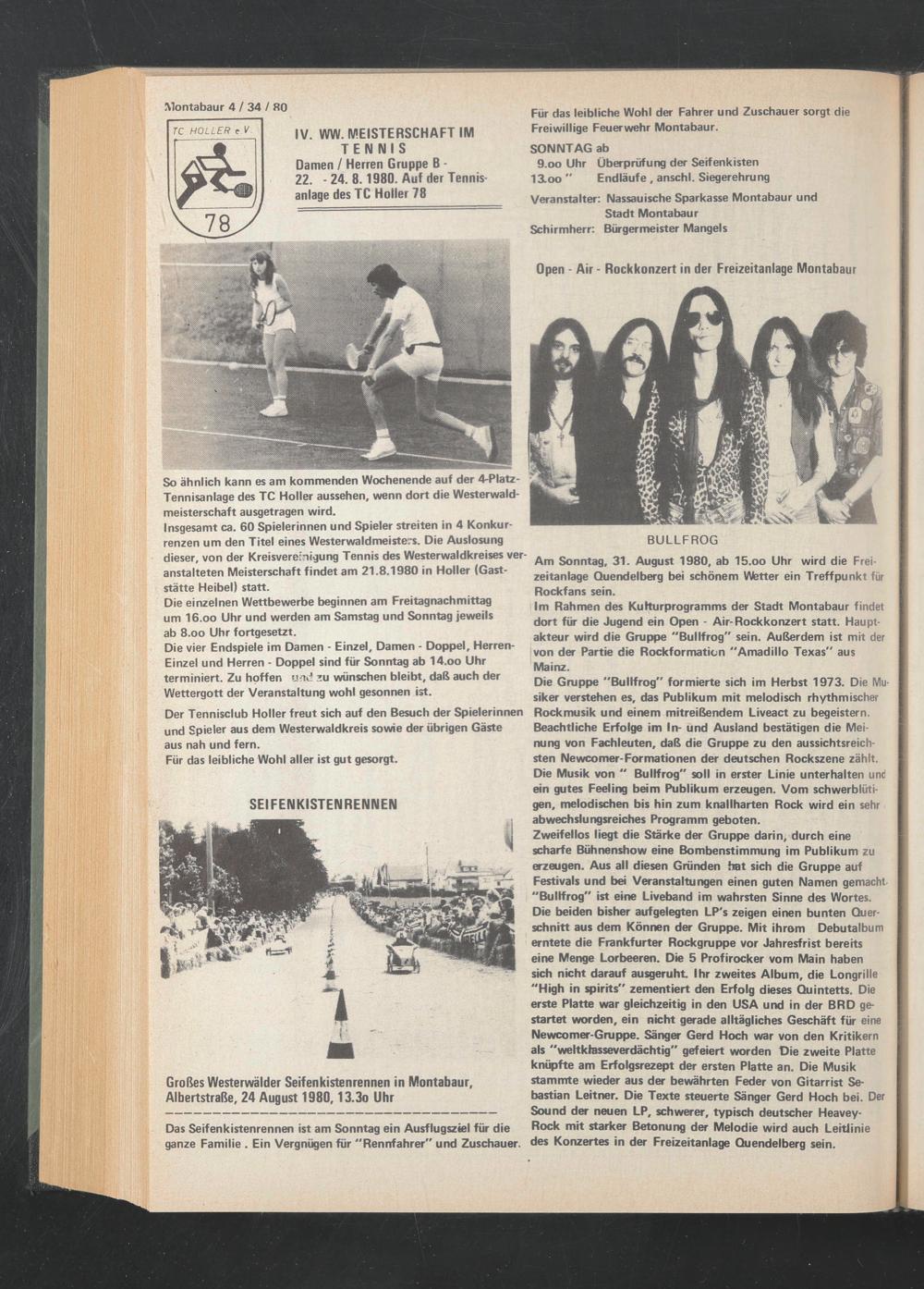 Im Rahmen des Kulturprogramms der Stadt Montabaur findet dort für die Jugend ein Open - Air-Rockkonzert statt. Hauptakteur wird die Gruppe "Bullfrog" sein. Außerdem ist mit der von der Partie die Rockformation "Amadillo Texas" aus Mainz.