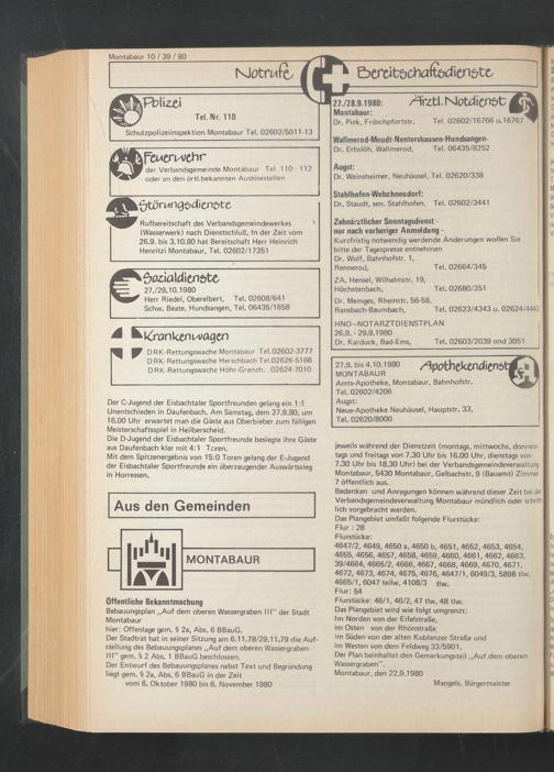 Rufbereitschaft des Verbandsgemeindewerkes (Wasserwerk) nach Dienstschluß. In der Zeit vom 26.9. bis 3.10.80 hat Bereitschaft Herr Heinrich Henritzi Montabaur, Tel. 02602/17351