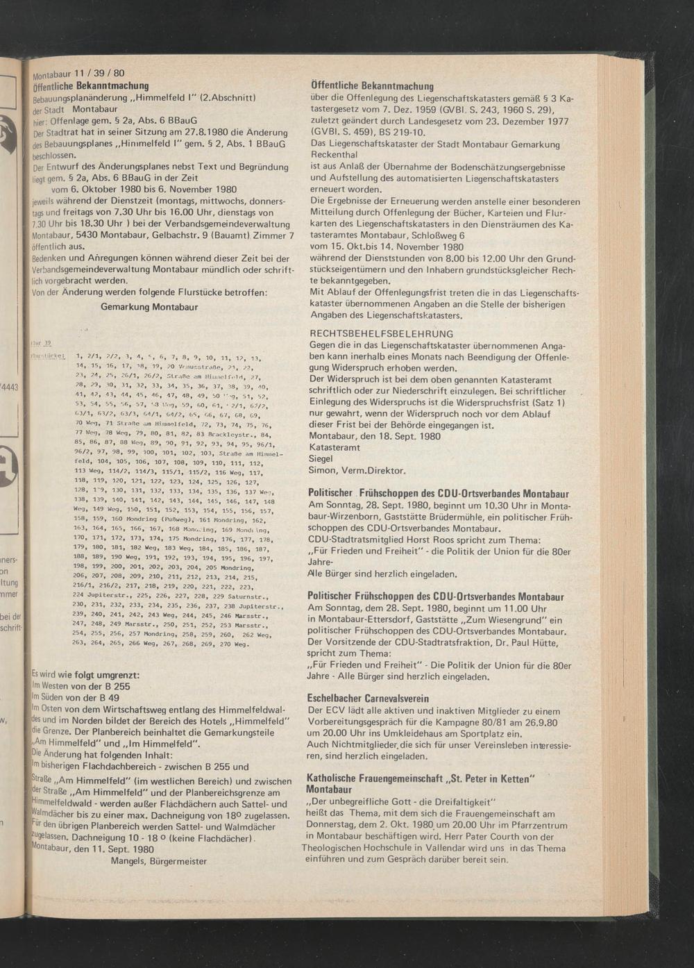 Am Sonntag, dem 28. Sept. 1980, beginnt um 11.00 Uhr in Montabaur-Ettersdorf, Gaststätte „Zum Wiesengrund" ein politischer Frühschoppen des CDU-Ortsverbandes Montabaur. Der Vorsitzende der CDU-Stadtratsfraktion, Dr. Paul Hütte, spricht zum Thema: