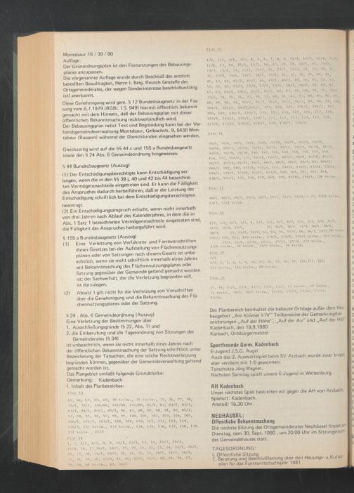 Gleichzeitig wird auf die §§ 44 c und 155 a Bundesbaugesetz sowie den § 24 Abs. 6 Gemeindeordnung hingewiesen.
