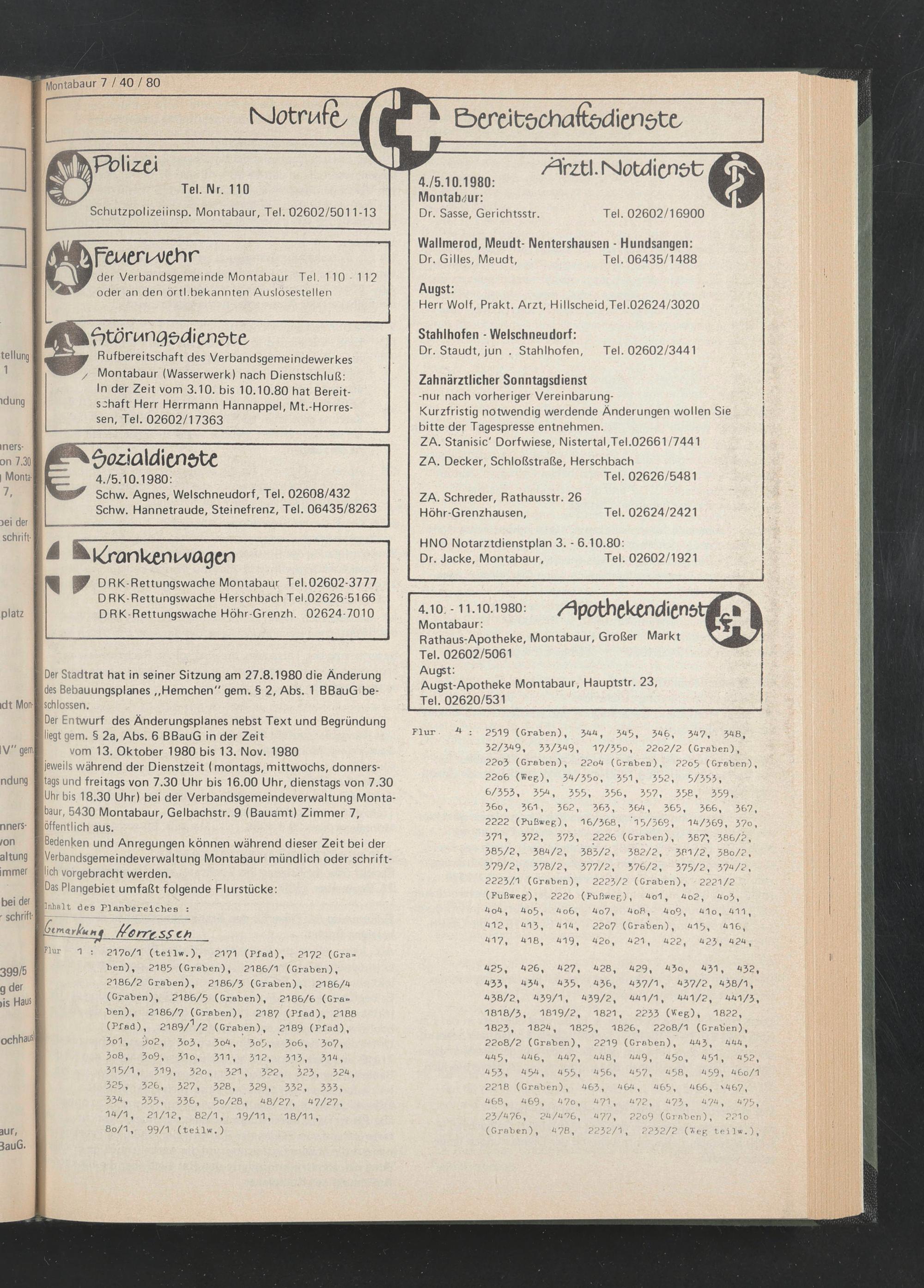 Rufbereitschaft des Verbandsgemeindewerkes / Montabaur (Wasserwerk) nach Dienstschluß: In der Zeit vom 3.10. bis 10.10.80 hat Bereitschaft Herr Herrmann Hannappel, Mt.-Horressen, Tel. 02602/17363