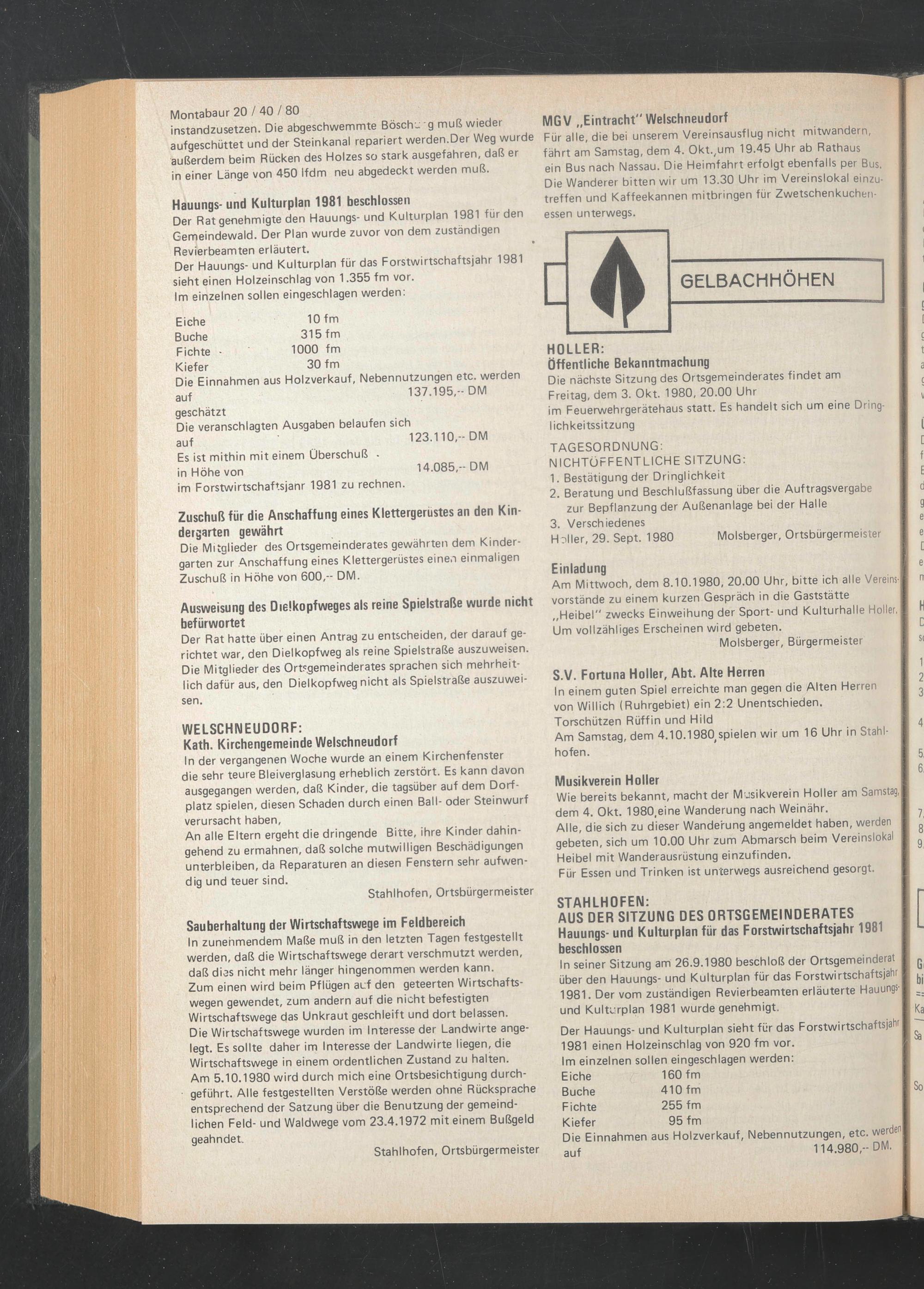ln seiner Sitzung am 26.9.1980 beschloß der Ortsgemeinderat I über den Hauungs- und Kulturplan für das Forstwirtschaftsjahr I 1981. Der vom zuständigen Revierbeamten erläuterte Hauungs j und Kulturplan 1981 wurde genehmigt. I