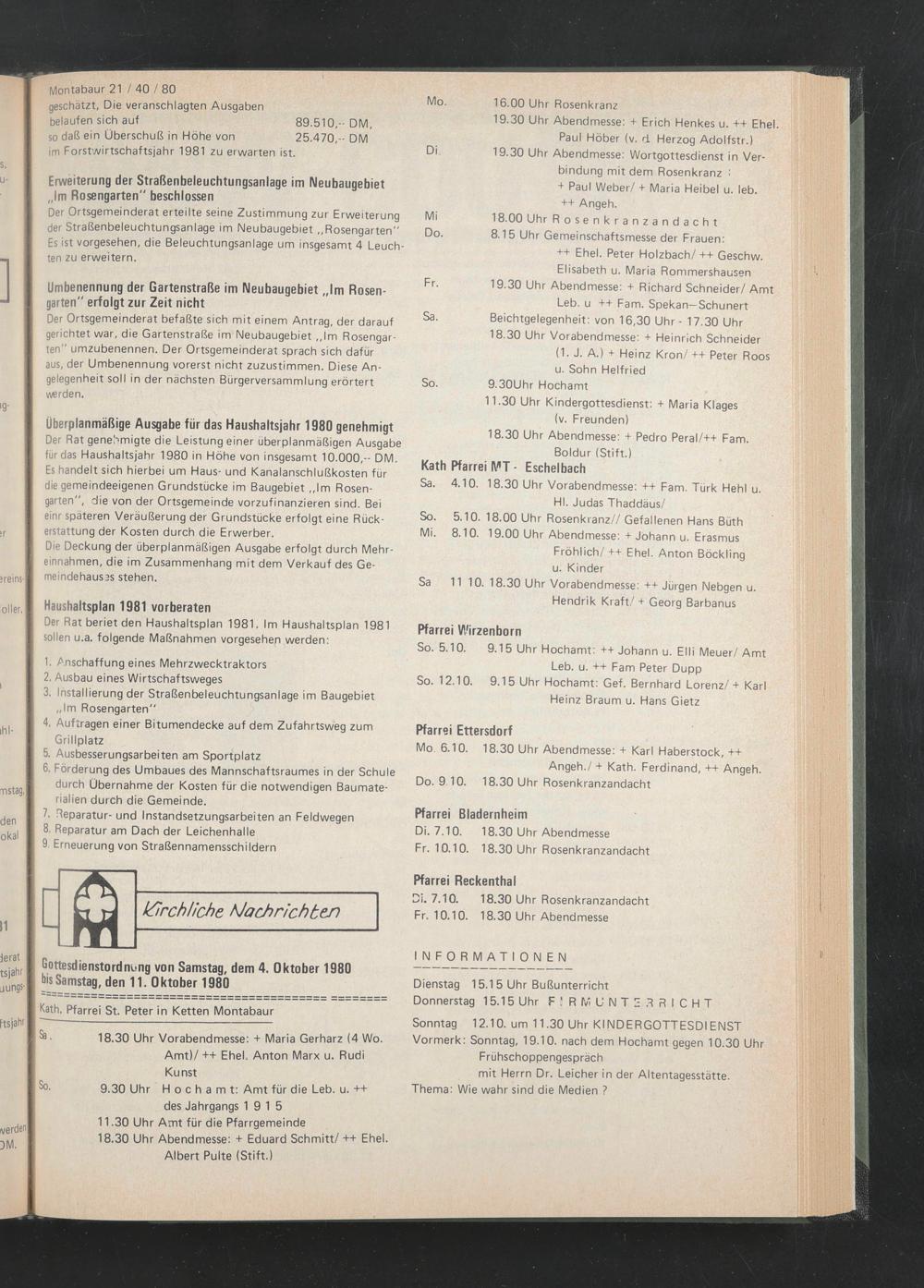 Gottesdienstordnung von Samstag, dem 4. Oktober 1980 bis Samstag, den 11. Oktober 1980