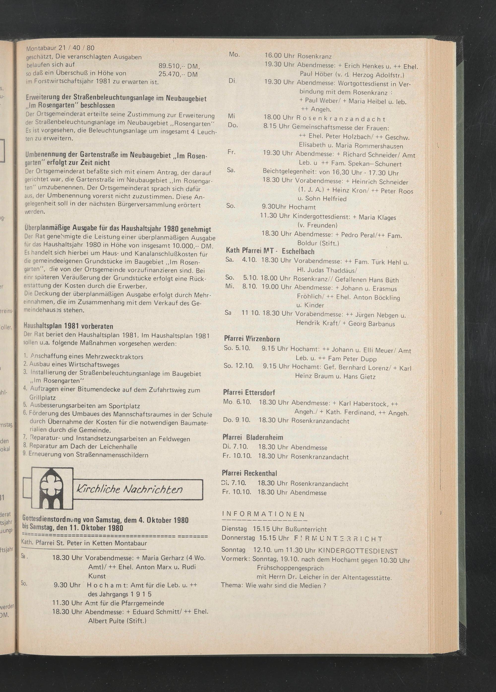 Der Rat beriet den Haushaltsplan 1981. Im Haushaltsplan 1981 sollen u.a. folgende Maßnahmen vorgesehen werden: