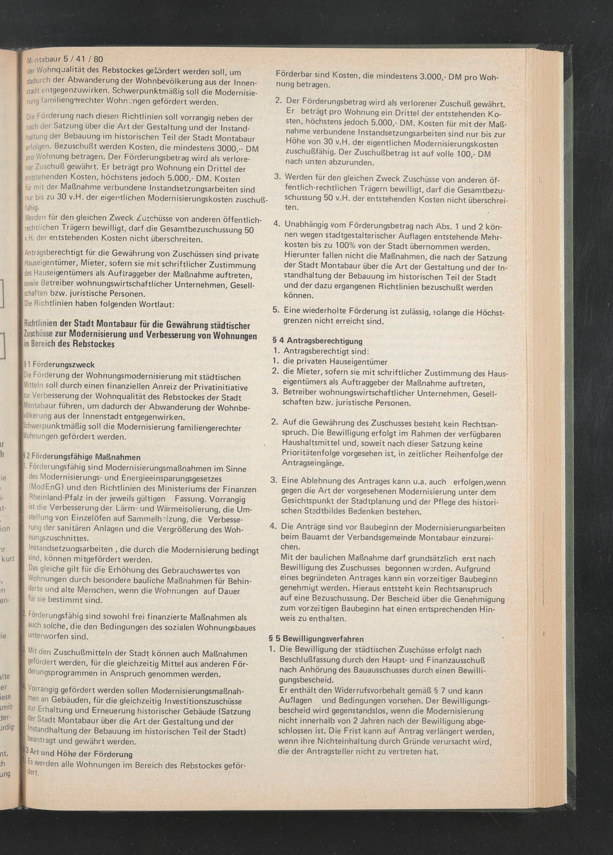 Die Förderung nach diesen Richtlinien soll vorrangig neben der nach der Satzung über die Art der Gestaltung und der Instandhaltung der Bebauung im historischen Teil der Stadt Montabaur erfolgen. Bezuschußt werden Kosten, die mindestens 3000,-- DM pro Wohnung betragen. Der Forderungsbetrag wird als verlorener Zuschuß gewährt. Er beträgt pro Wohnung ein Drittel der entstehenden Kosten, höchstens jedoch 5.000,- DM. Kosten für mit der Maßnahme verbundene Instandsetzungsarbeiten sind nur bis zu 30 v.H. der eigentlichen Modernisierungskosten zuschußfähig.