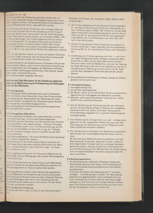 [Die Förderung der Wohnungsmodernisierung mit städtischen [Mitteln soll durch einen finanziellen Anreiz der Privatinitiative [zur Verbesserung der Wohnqualität des Rebstockes der Stadt iMontabaur führen, um dadurch der Abwanderung der Wohnbevölkerung aus der Innenstadt entgegenwirken.