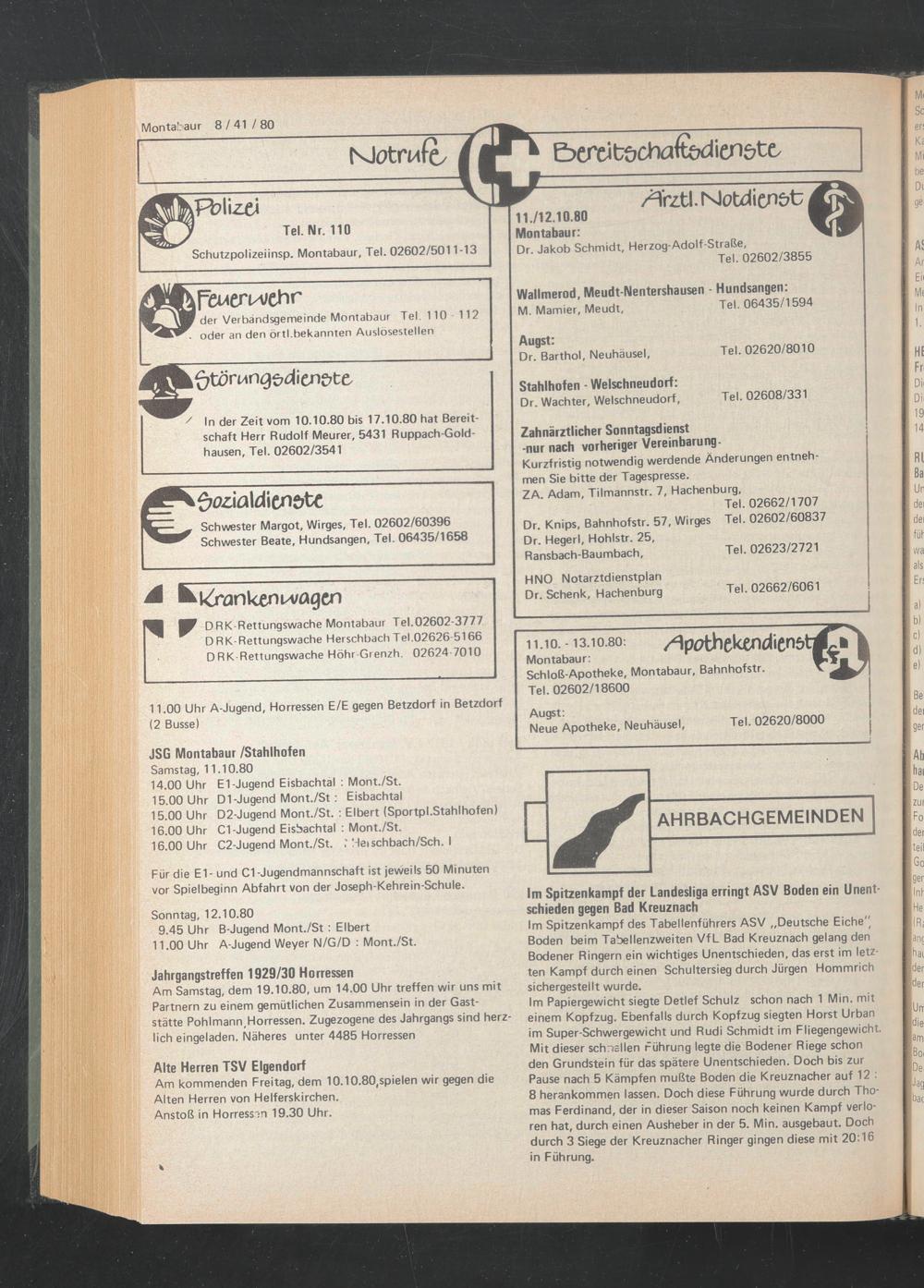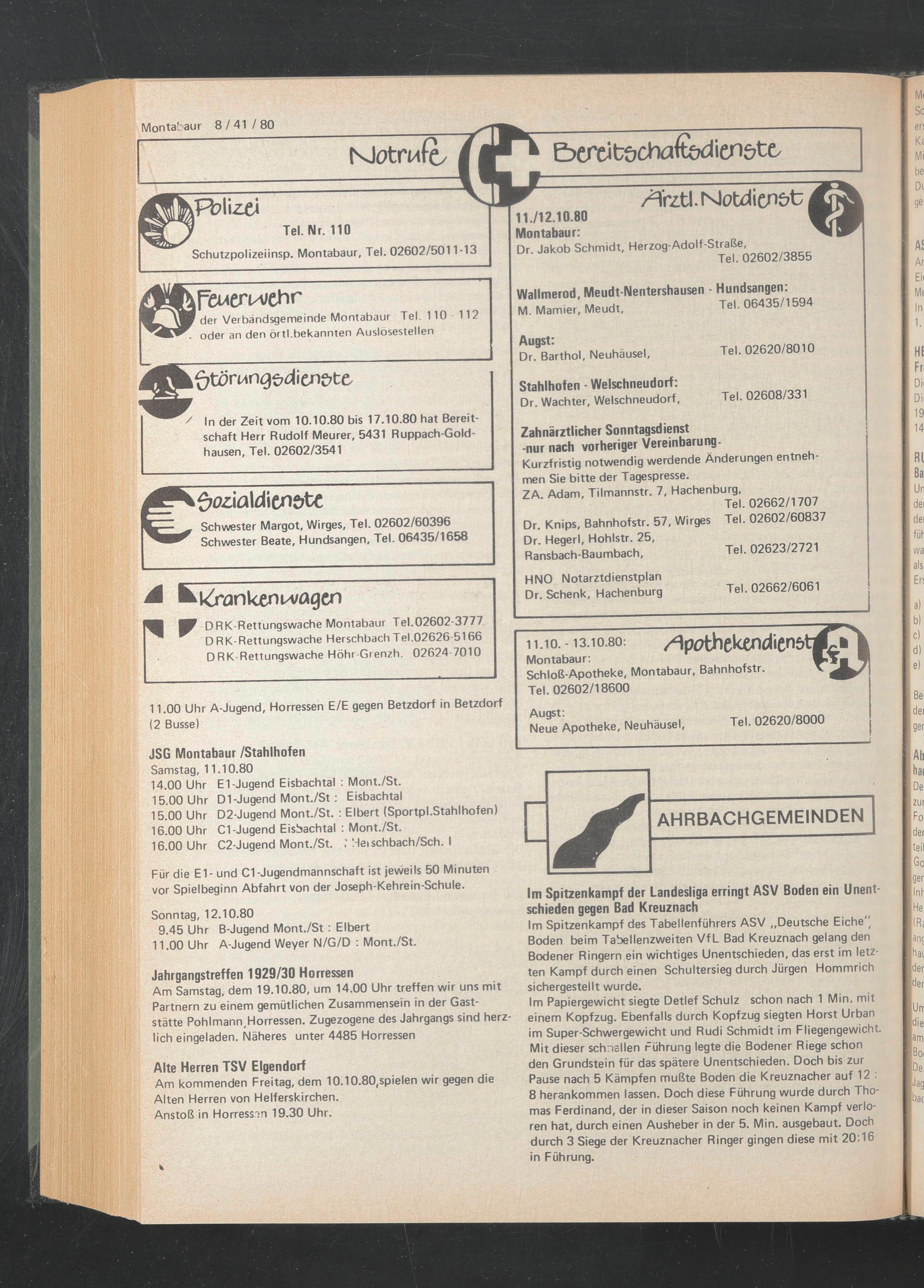 y ln der Zeit vom 10.10.80 bis 17.10.80 hat Bereitschaft Herr Rudolf Meurer, 5431 Ruppach-Goldhausen, Tel. 02602/3541