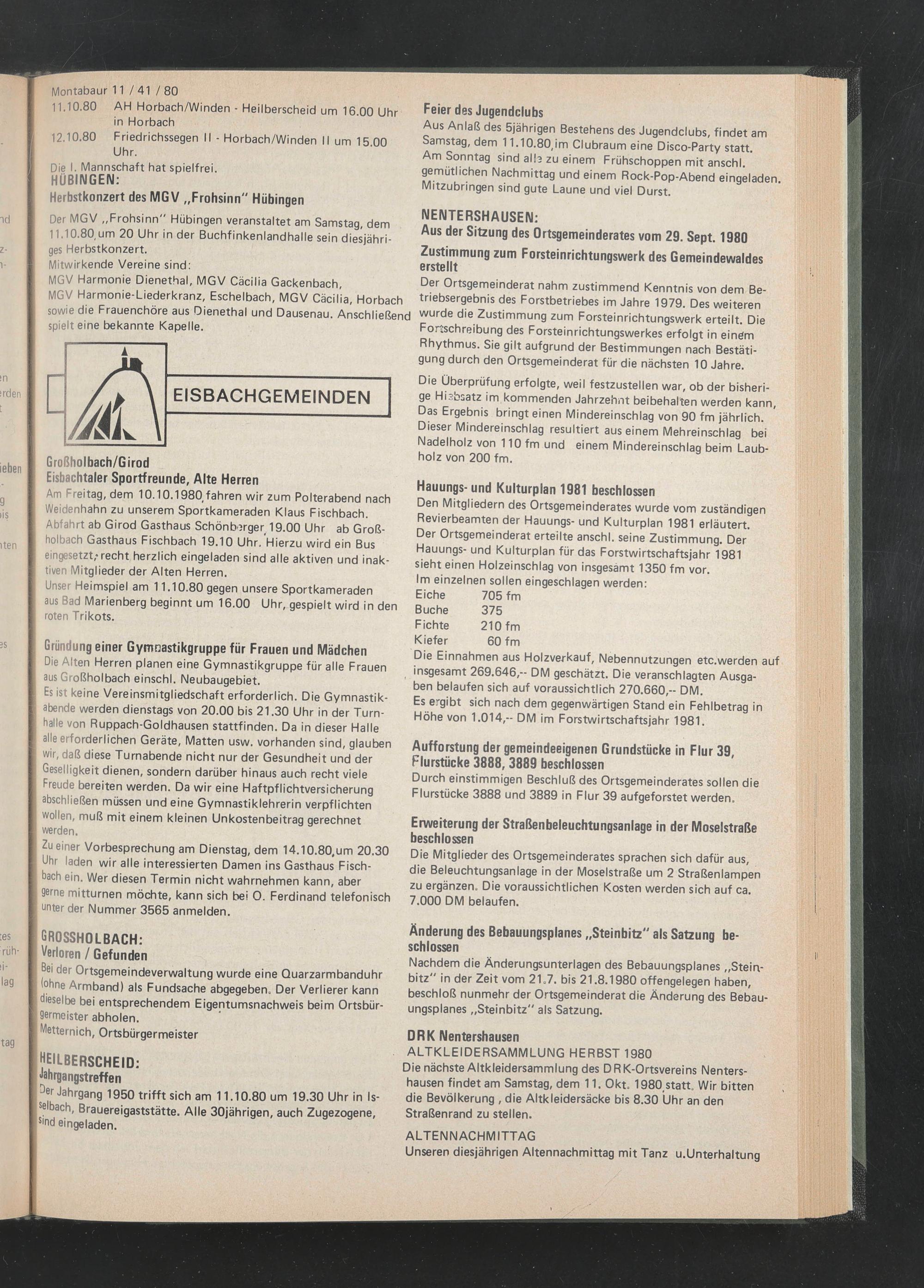 Der Ortsgemeinderat nahm zustimmend Kenntnis von dem Betriebsergebnis des Forstbetriebes im Jahre 1979. Des weiteren wurde die Zustimmung zum Forsteinrichtungswerk erteilt. Die Fortschreibung des Forsteinrichtungswerkes erfolgt in einem Rhythmus. Sie gilt aufgrund der Bestimmungen nach Bestätigung durch den Ortsgemeinderat für die nächsten 10 Jahre.