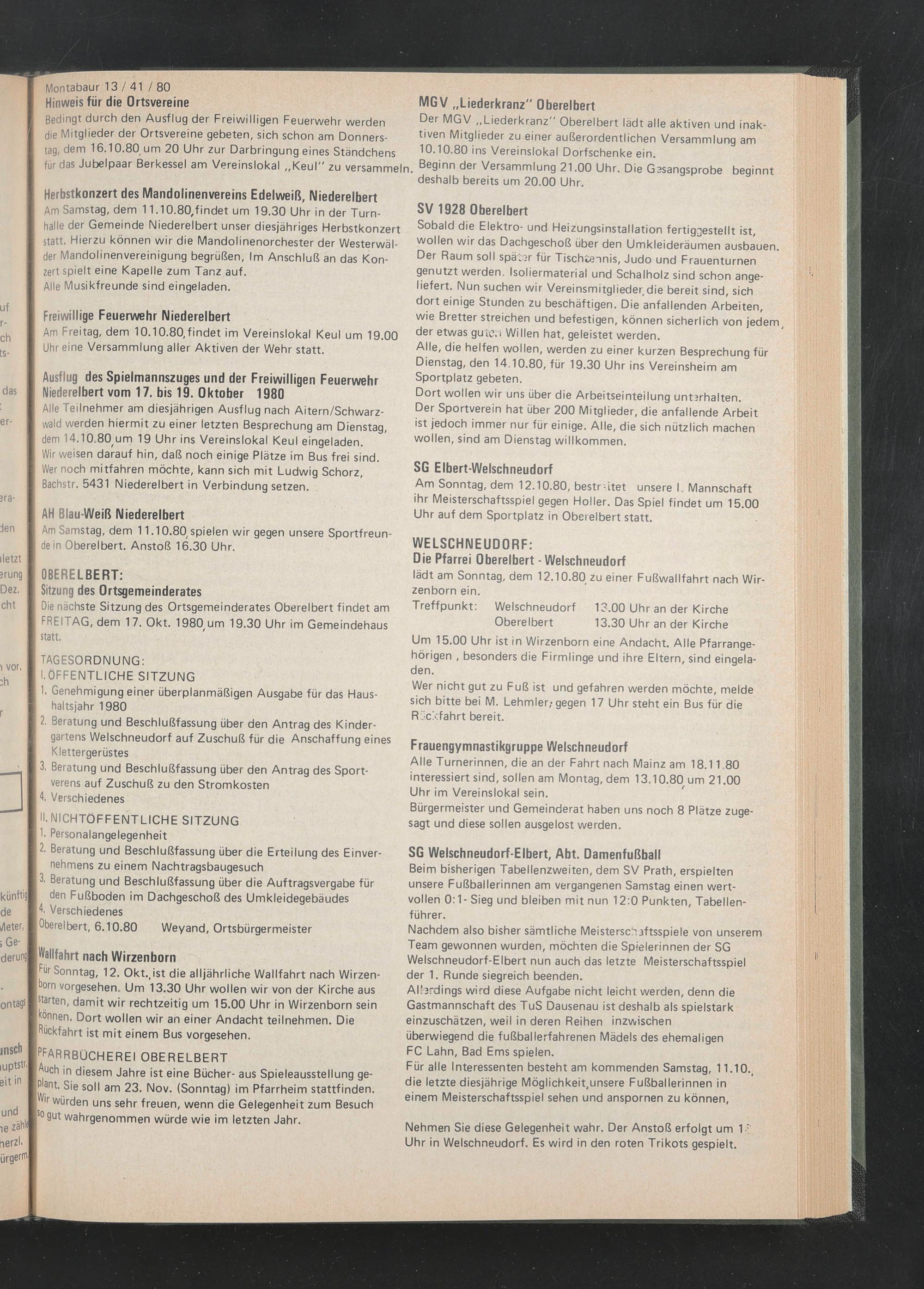 Die nächste Sitzung des Ortsgemeinderates Oberelbert findet am FREITAG, dem 17. Okt. 1980,um 19.30 Uhr im Gemeindehaus statt.