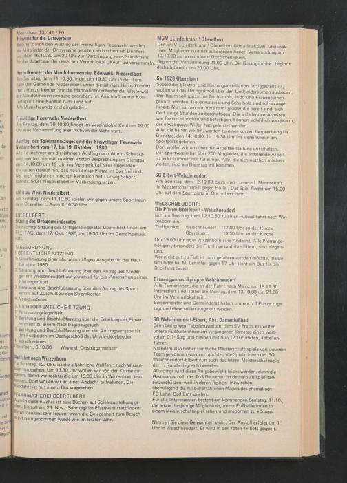 Bedingt durch den Ausflug der Freiwilligen Feuerwehr werden die Mitglieder der Ortsvereine gebeten, sich schon am Donnerstag, dem 16.10.80 um 20 Uhr zur Darbringung eines Ständchens für das Jubelpaar Berkessel am Vereinslokal „Keul" zu versammeln