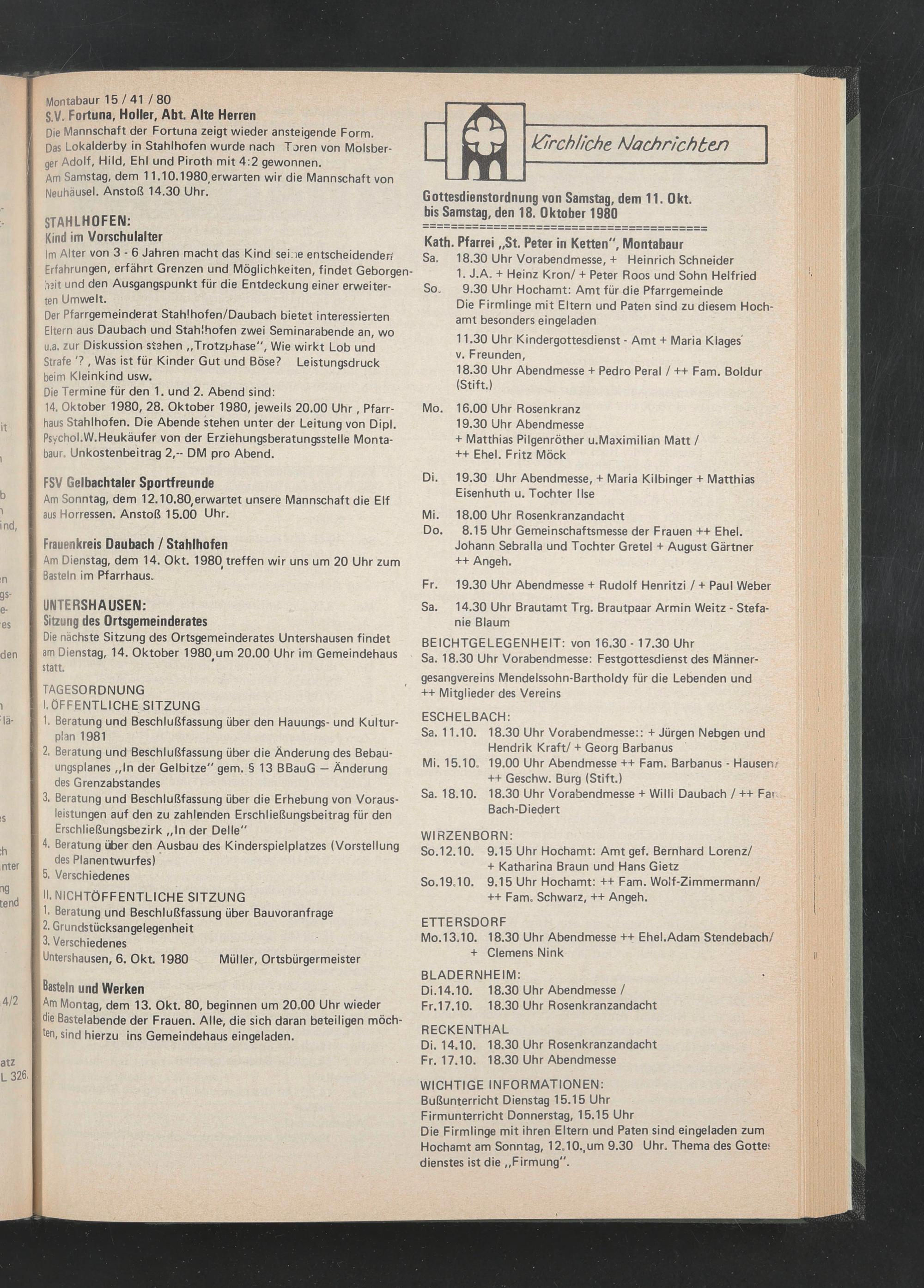 Die nächste Sitzung des Ortsgemeinderates Untershausen findet am Dienstag, 14. Oktober 1980,um 20.00 Uhr im Gemeindehaus statt.